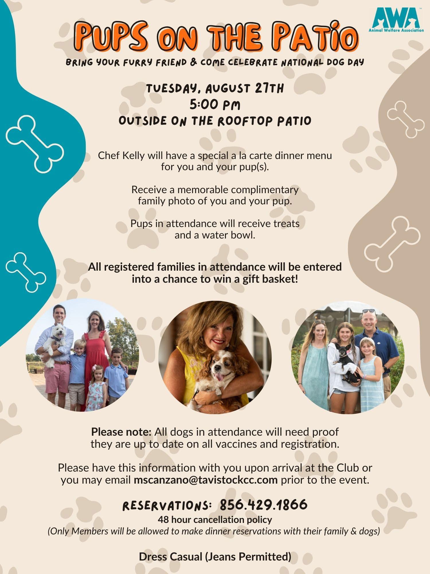 The annual National Dog Day at Tavistock has been rebranded to “Pups on the Patio”. This is an event for the entire family, especially your precious pup(s). It will take place on the patio Tuesday, August 27th. Don’t leave your puppies at home, bring them to TCC, where they can dine with the family. We will have a special menu with dishes both you and your dog can choose from. AWA will be at the Club and a complimentary printed family pup photo will be your souvenir. You will also have a chance to win a woof basket with treats and goodies for humans and furry friends. Ala carte reservations are required and a proof of vaccines.
