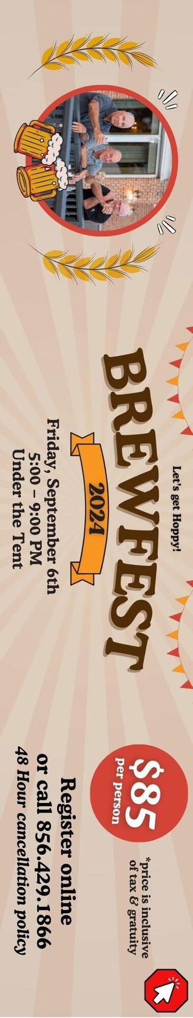 and celebrate the end of summer in style at the annual Brewfest on Friday, September 6th from 5:00 to 9:00PM. This ever-popular event will be held under the tent and will feature 11 craft breweries: Swedesboro, Whims and Armageddon Hard Ciders will be here for the first time along with Spellbound, Kings Road, Kane, Double Nickel, Anglesea, Gusto, Farm Truck and Bucket Brigade. Chef Kelly will be preparing a tasty buffet and Bob Anderson will provide the live music. Guests are welcome so get your reservations early!