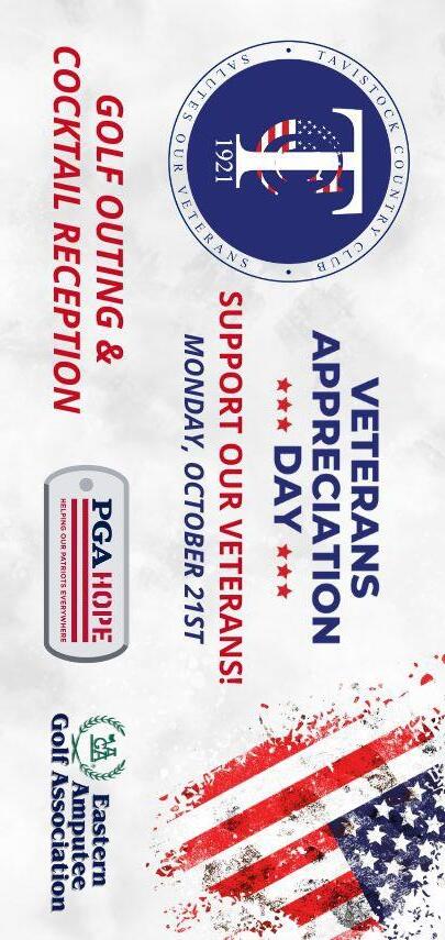 Tavistock Country Club will honor guest and member veterans at TCC’s Annual “Veterans Appreciation Day,” on Monday, October 21st, with boxed lunch at 12:00 noon followed by a Golf Outing, starting at 1:00 PM. The foursome will include a veteran guest from Eastern Amputee Golf Association and this year, we’ve invited PGA Hope to help honor our Vets on the course and at our cocktail party.