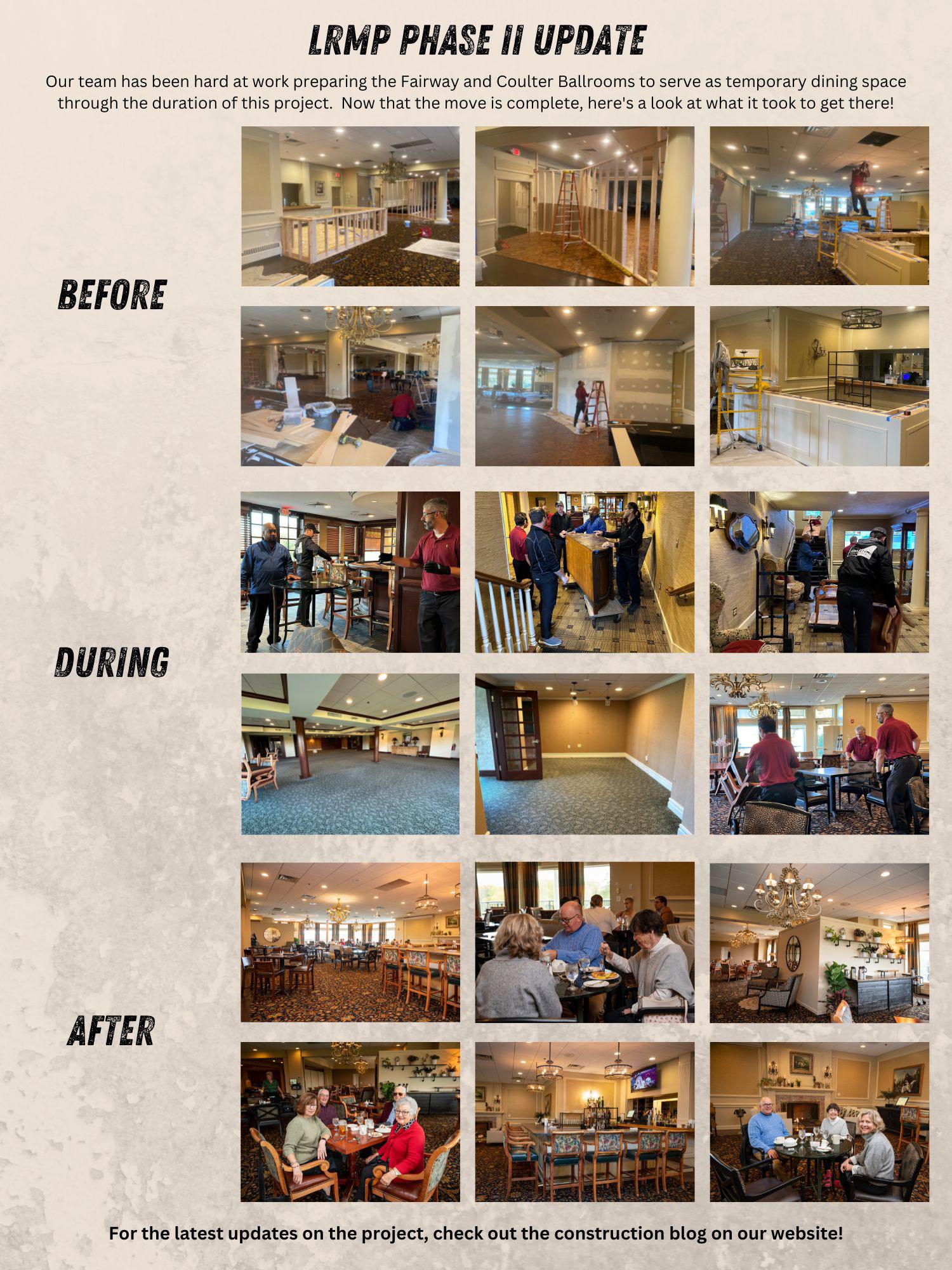 So, you’ve probably settled in to the revamped dining room layout resulting from the upgrade to our downstairs dining areas . . . or maybe you haven’t? If you haven’t come to lunch or dinner, you’ll be pleasantly surprised at the comfortable ambiance our staff have created in the ballroom area. Although we can’t wait to make use of the updated facilities downstairs, a night out at TCC is still quite nice during the construction.