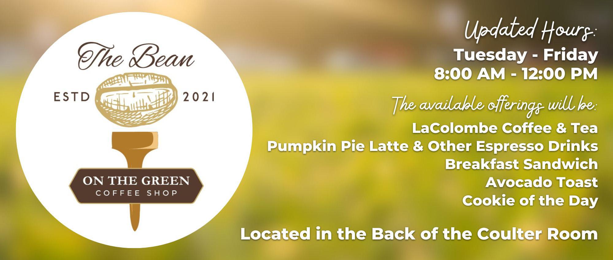 The Bean on the Green Coffee Shop Tuesday-Sunday 8:00 AM-12:00 PM