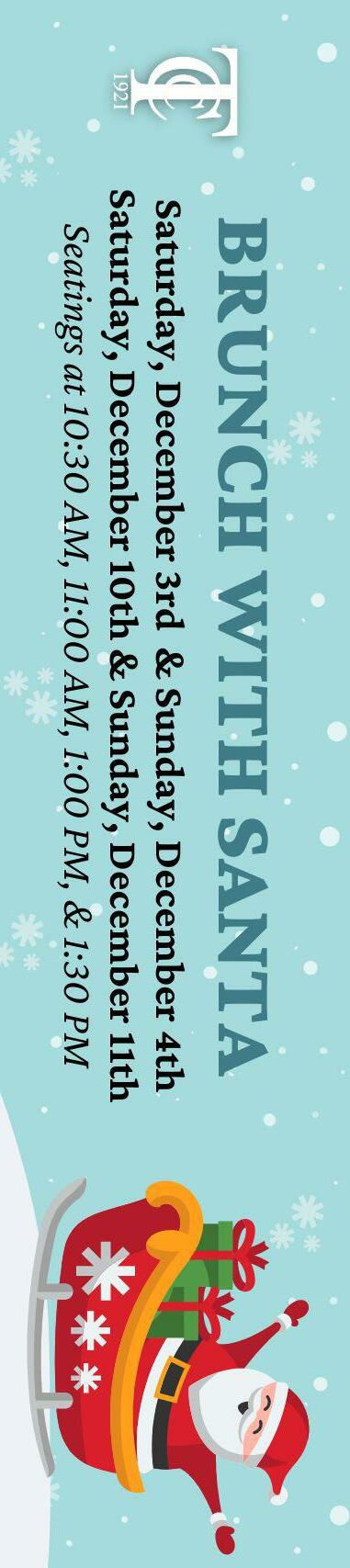 Up next, join us for Brunch with Santa on Saturday, December 3rd or 10th and Sunday December 4th or December 11th. Join us for photos with Santa.