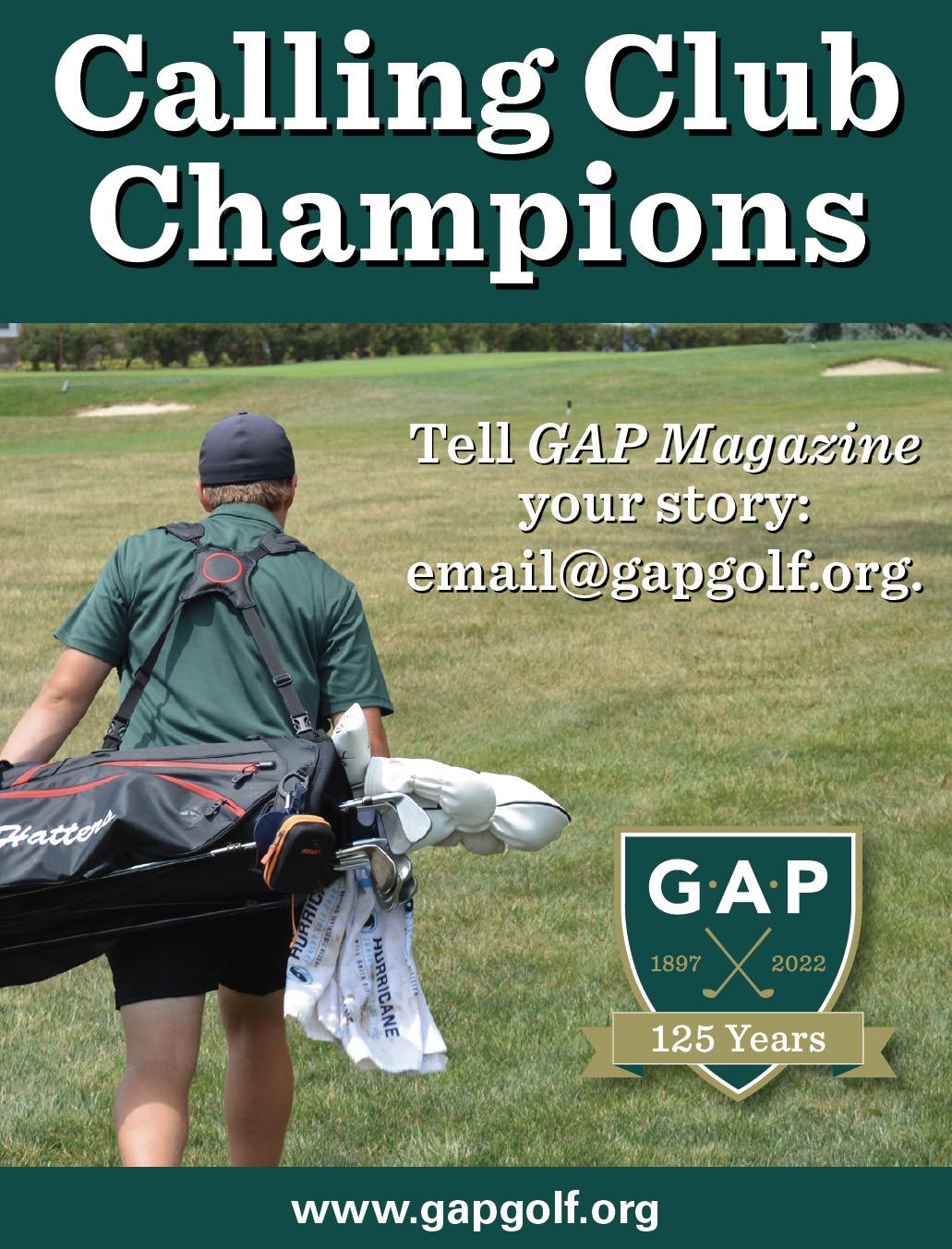 Anything out of the ordinary occur in your club championships this year? Did your club’s men’s, women’s, Junior, senior or super-senior champion have meaning behind the magic? Or perhaps one of your club’s champions reached a milestone in 2022? GAP Magazine wants to know. Email your suggestions to Tony Regina, GAP Assistant Communications Director, at tregina@gapgolf.org.