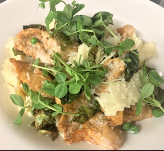 English peas, pea tendrils, crispy brussels sprout leaves, roasted lemon cream with house made salmon sausage (white fish, shrimp, salmon)