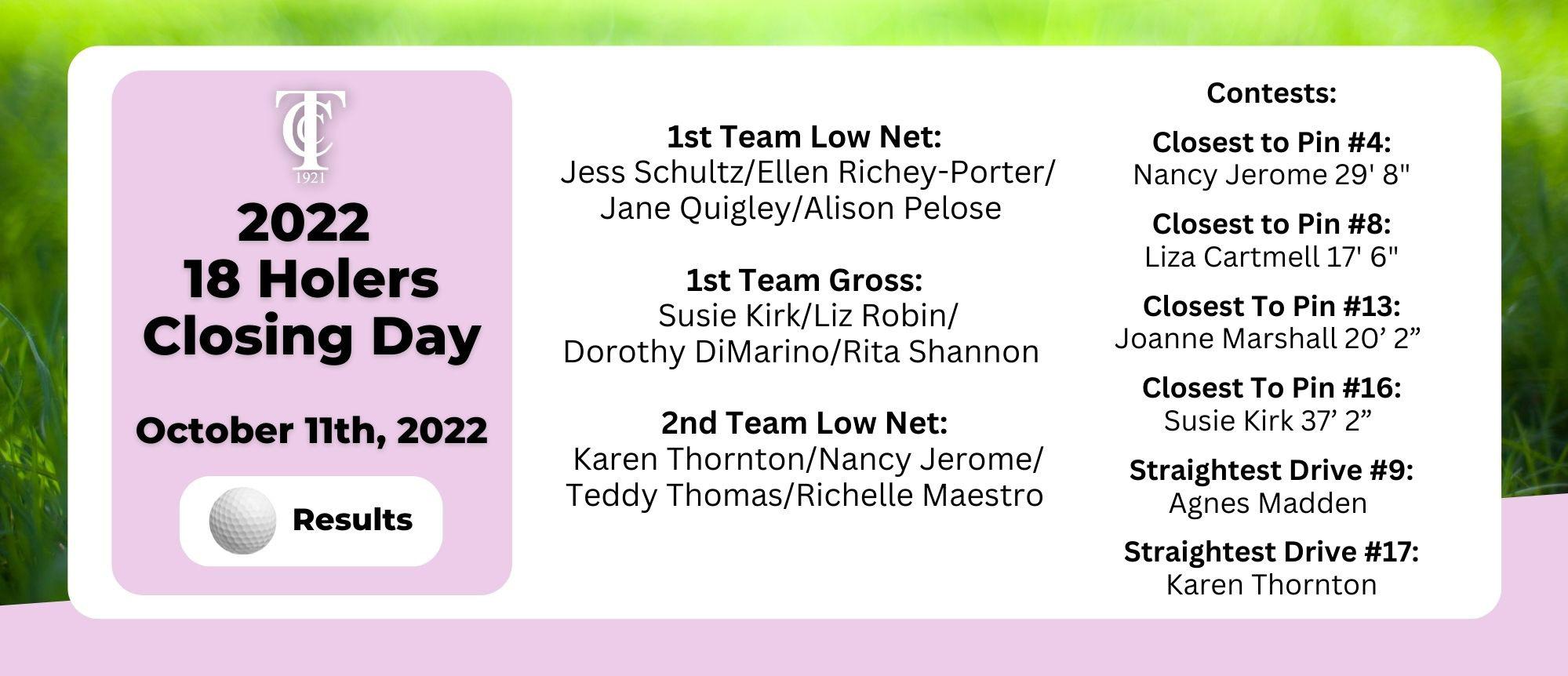 The Women’s 18 Hole Golf League completed its 2022 season with a Closing Day Tournament and celebration. The beautiful fall day created the perfect backdrop for the afternoon shotgun start. The tournament format was two better balls of foursome and there were numerous on-course contests. The celebration continued after golf in the ladies locker room and outdoor patio with food stations and passed hors d’oeuvres. It was a fabulous way to celebrate friendships and the tournament winners.