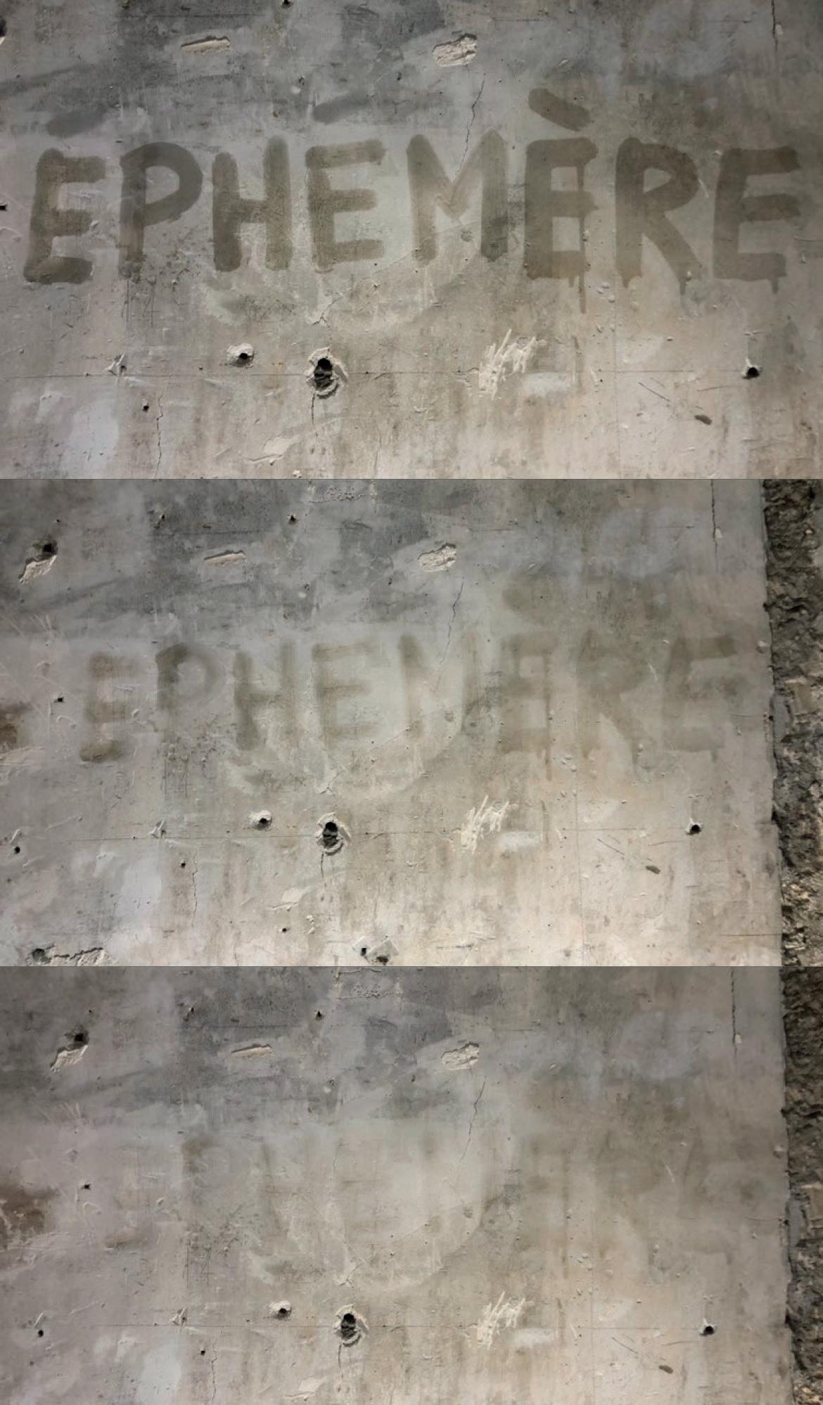 Ici, le mot éphémère est écrit à l’eau sur du béton, avec le temps et la chaleur, le mot va finir par disparaître à cause de l’évaporation. Les trois clichés offrent au spec-