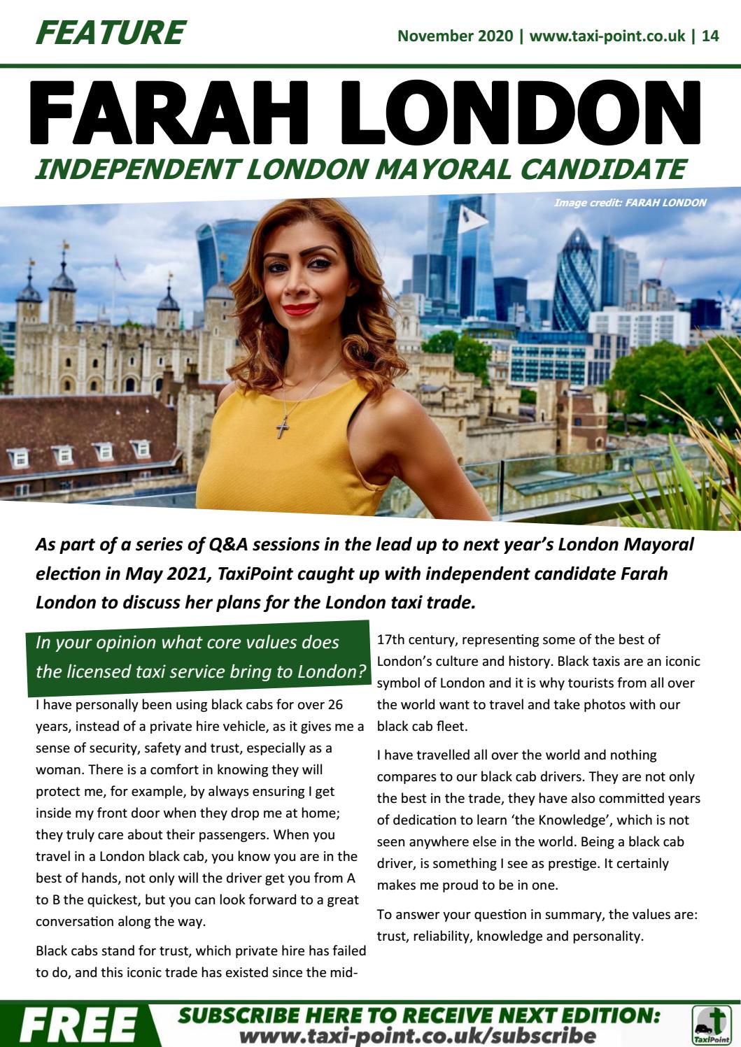 As part of a series of Q&A sessions in the lead up to next year’s London Mayoral election in May 2021, TaxiPoint caught up with independent candidate Farah London to discuss her plans for the London taxi trade. 17th century, representing some of the best of London’s culture and history. Black taxis are an iconic symbol of London and it is why tourists from all over the world want to travel and take photos with our I have personally been using black cabs for over 26 years, instead of a private hire vehicle, as it gives me a black cab fleet. sense of security, safety and trust, especially as a I have travelled all over the world and nothing woman. There is a comfort in knowing they will compares to our black cab drivers. They are not only protect me, for example, by always ensuring I get the best in the trade, they have also committed years inside my front door when they drop me at home; of dedication to learn ‘the Knowledge’, which is not they truly care about their passengers. When you seen anywhere else in the world. Being a black cab travel in a London black cab, you know you are in the driver, is something I see as prestige. It certainly best of hands, not only will the driver get you from A makes me proud to be in one. to B the quickest, but you can look forward to a great To answer your question in summary, the values are: conversation along the way. trust, reliability, knowledge and personality. Black cabs stand for trust, which private hire has failed to do, and this iconic trade has existed since the mid-
