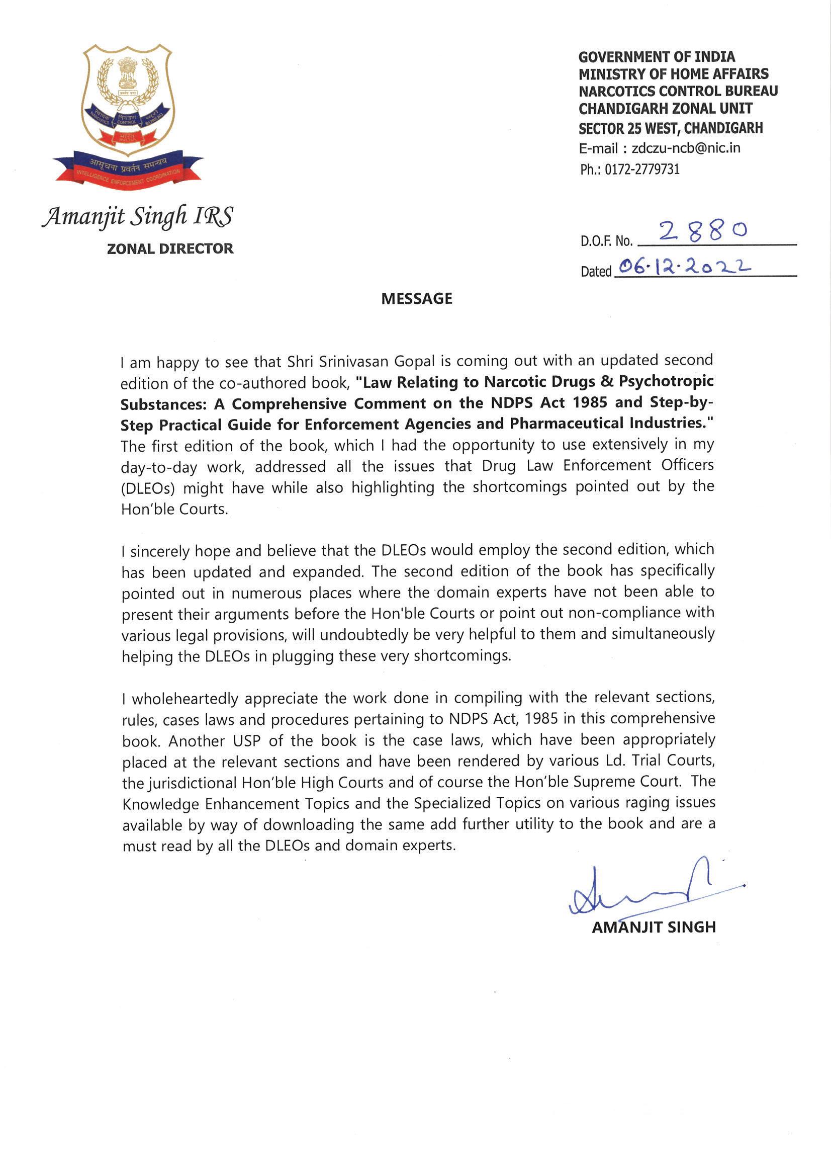 I had the privilege of regularly interacting with him on various aspects of NDPS Act, 1985 and related issues while holding different assignments with the GovSouth Asia. I have found him to be exceptionally passionate about his academic interests, and the National Academy of Indirect Taxes, Customs and Narcotics, Faridabad, and its Zonal Units, as well as other empowered departments, are making full use of his insights into the provisions of the NDPS Act, 1985.