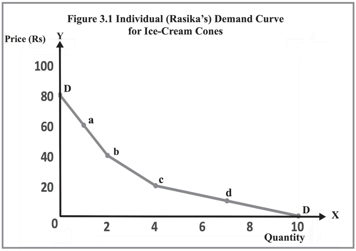 Figure 3.1 depicts Rasika’s demand for vanilla ice cream cones. On the vertical axis, the price is measured, and on the horizontal axis, the quantity of ice cream cones is measured. Rasika is not buying ice cream cones at a price of ` 80 or above. Similarly, she can have ten ice cream cones at a zero price. The demand curve DD slopes downward from left to right because Rasika wants to consume more ice cream cones only if the price falls and vice versa.