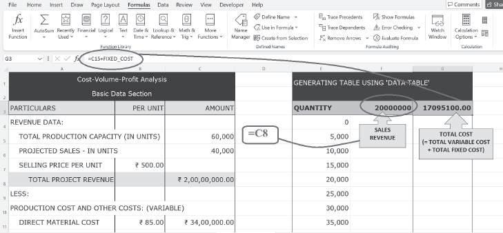 In F3, enter the reference for the cell that contains the formula for calculating ‘sales revenue’ (i.e. C8). Similarly, in G3 enter the reference for the cell where ‘total cost’ is calculated: