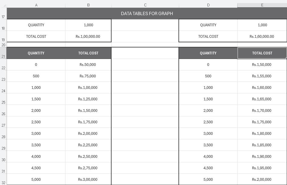 Using the ‘Data Table’ feature of Excel, the total cost for various levels of output for the two machines can be represented in a tabular format: