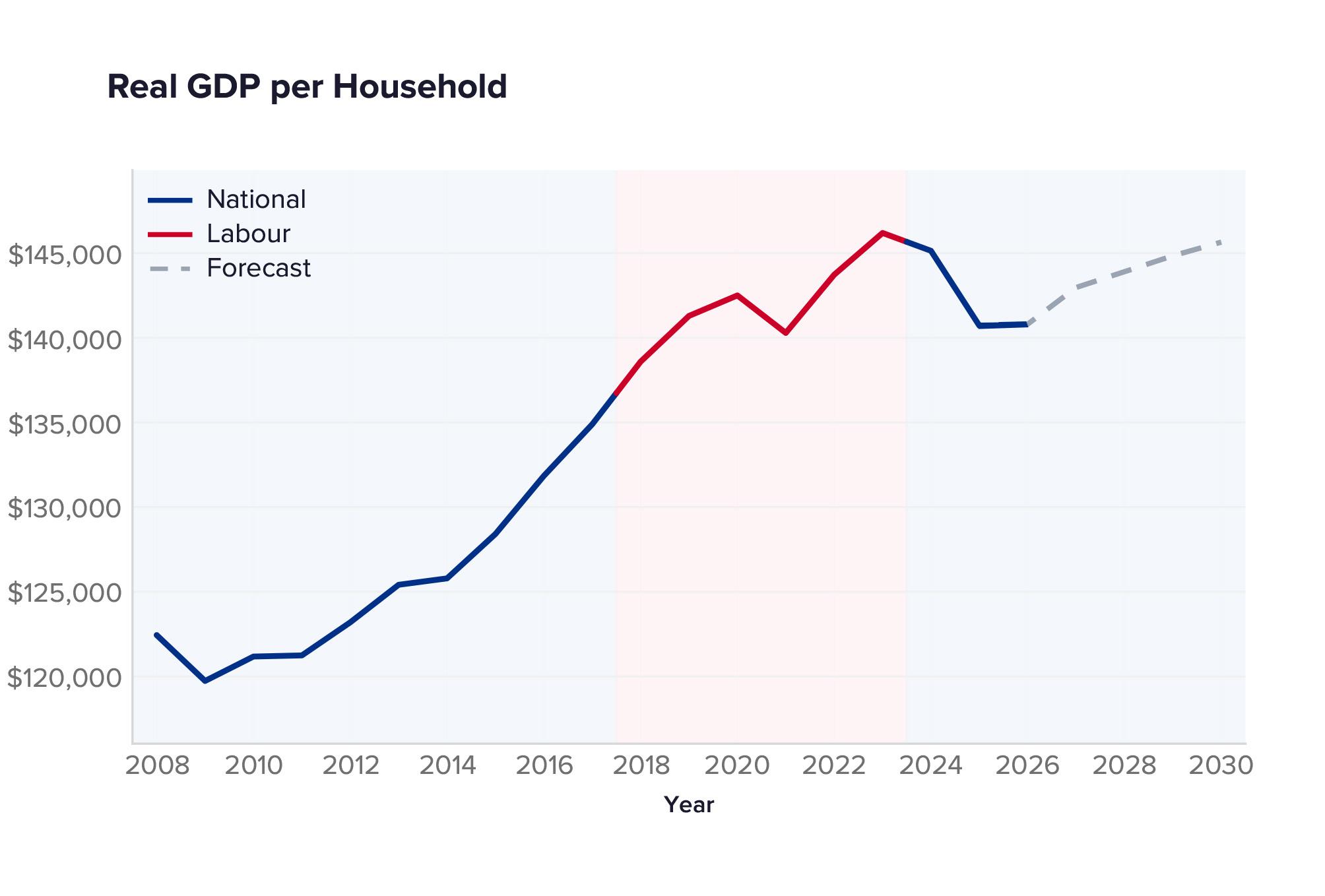 In other words, New Zealanders are 3.7 percent worse off than they were only two years ago, and GDP per household is not expected to recover any time before 203013.