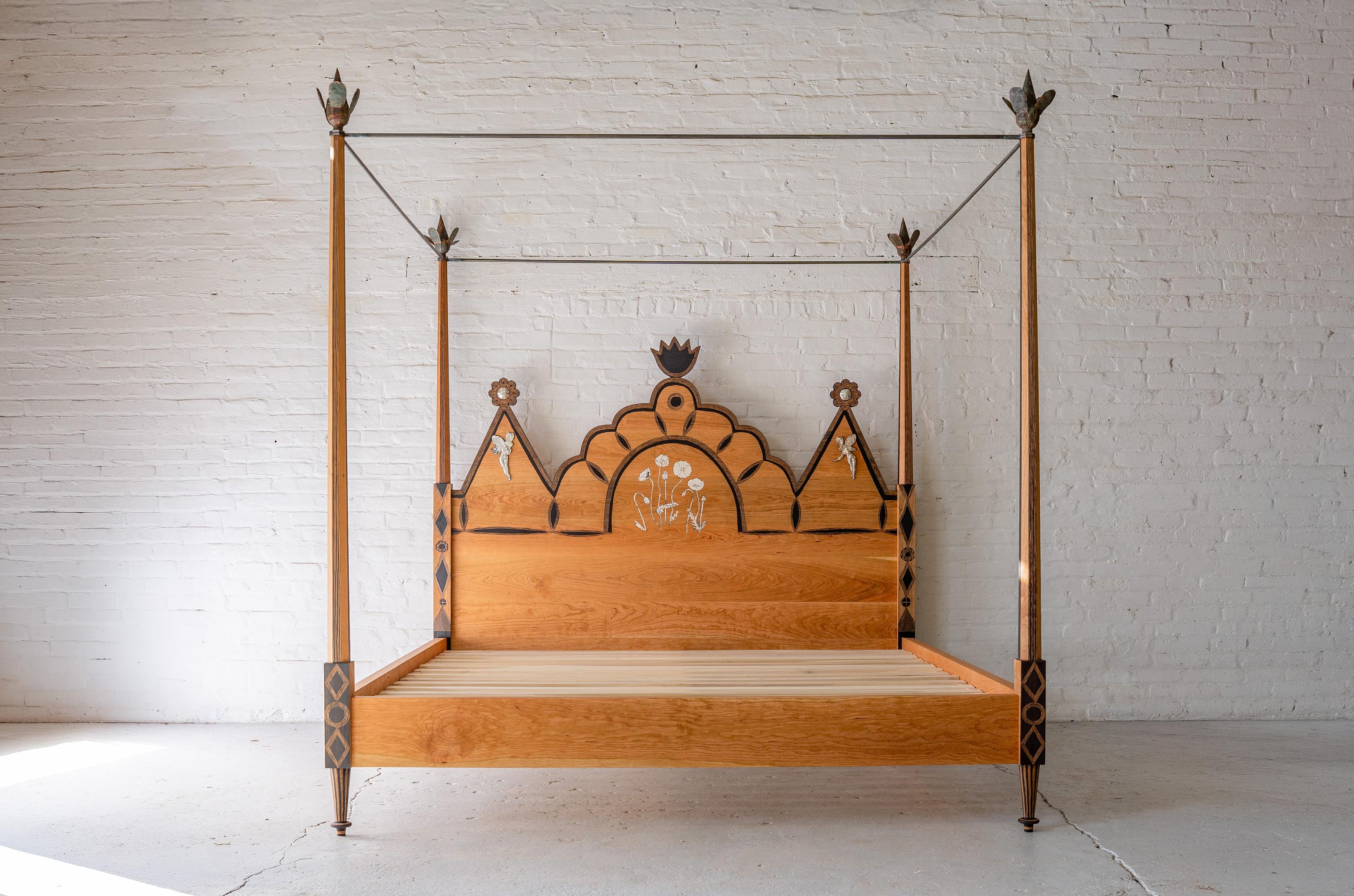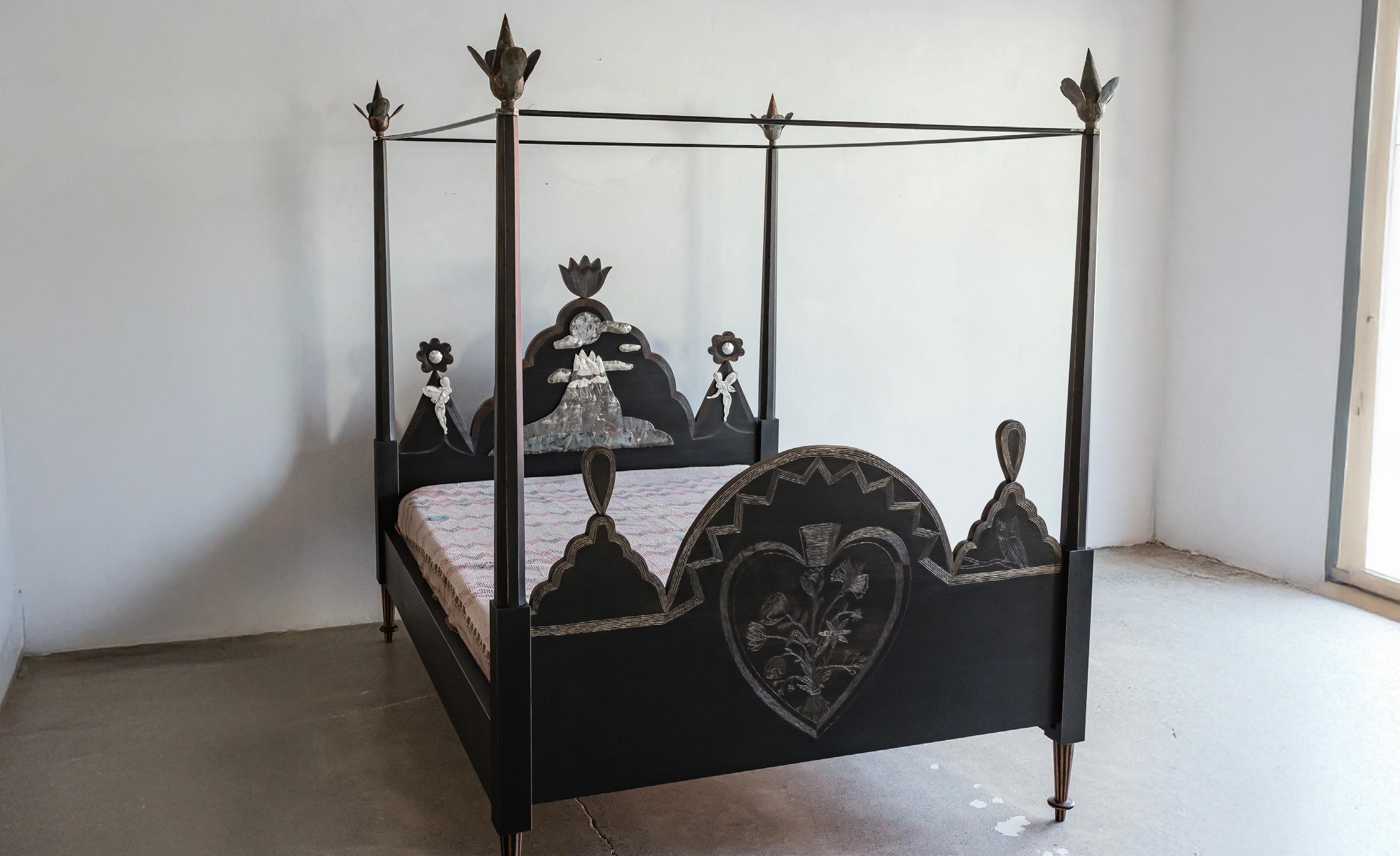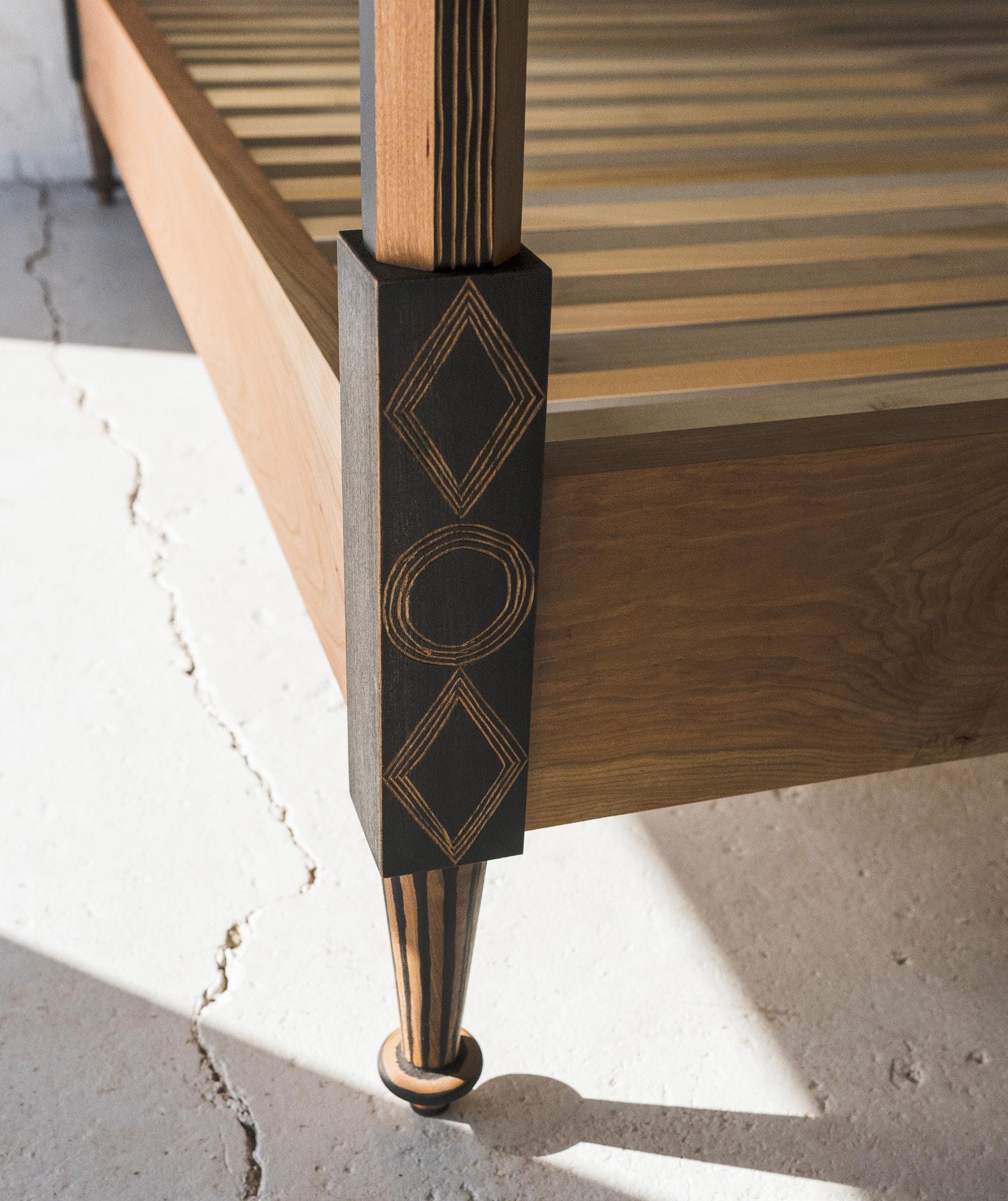 King sized, ebonized cherry with carvings and hammered silver