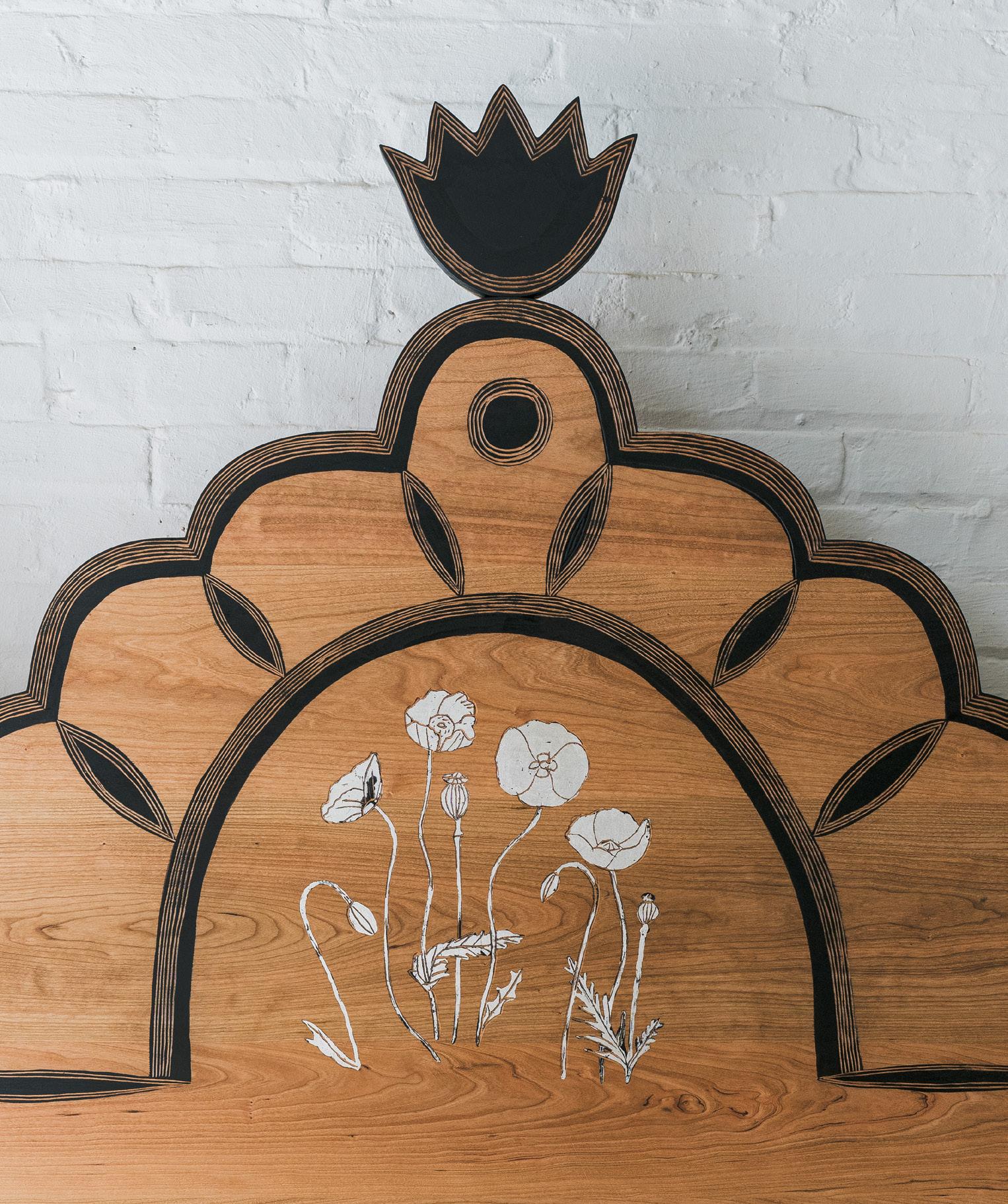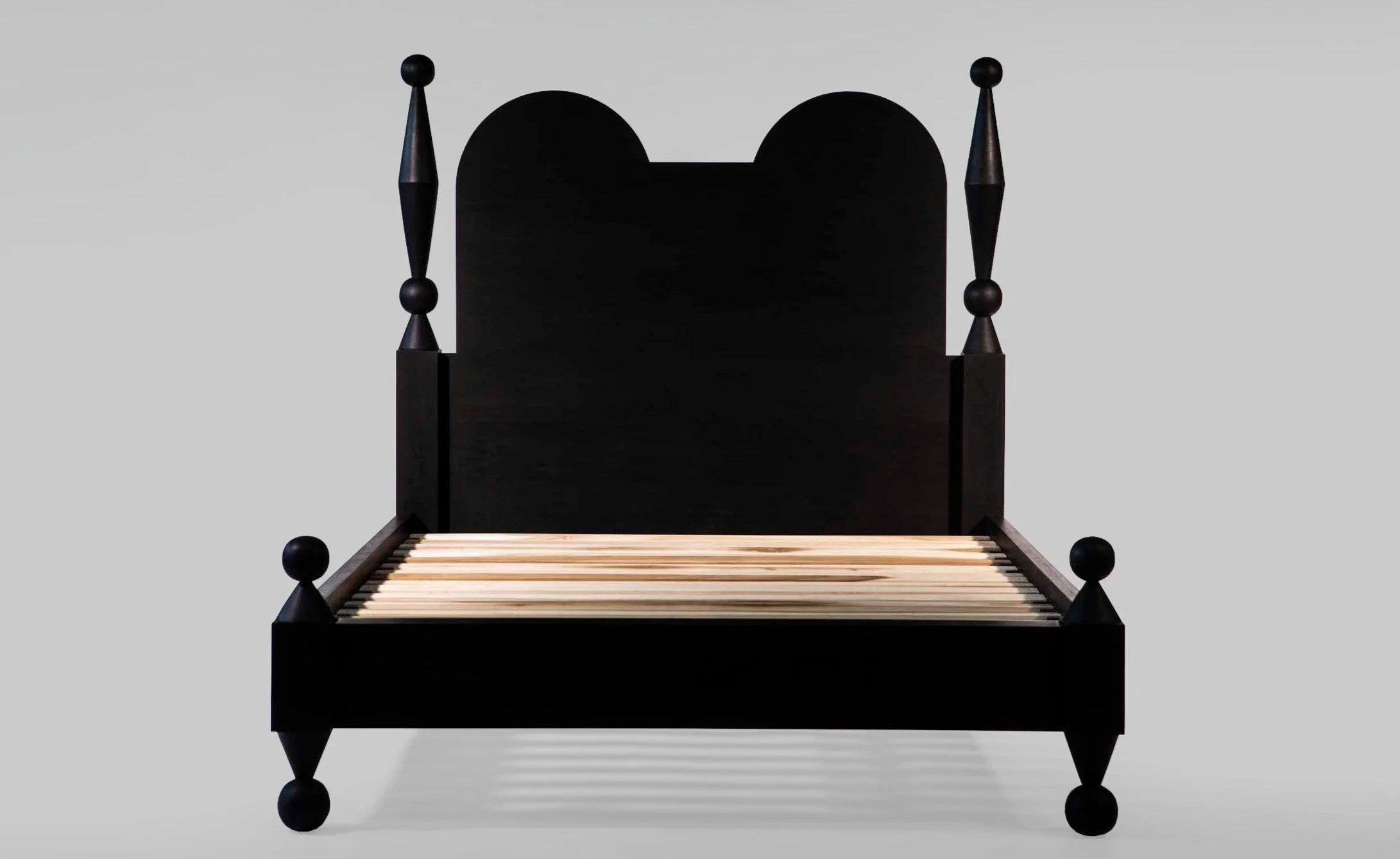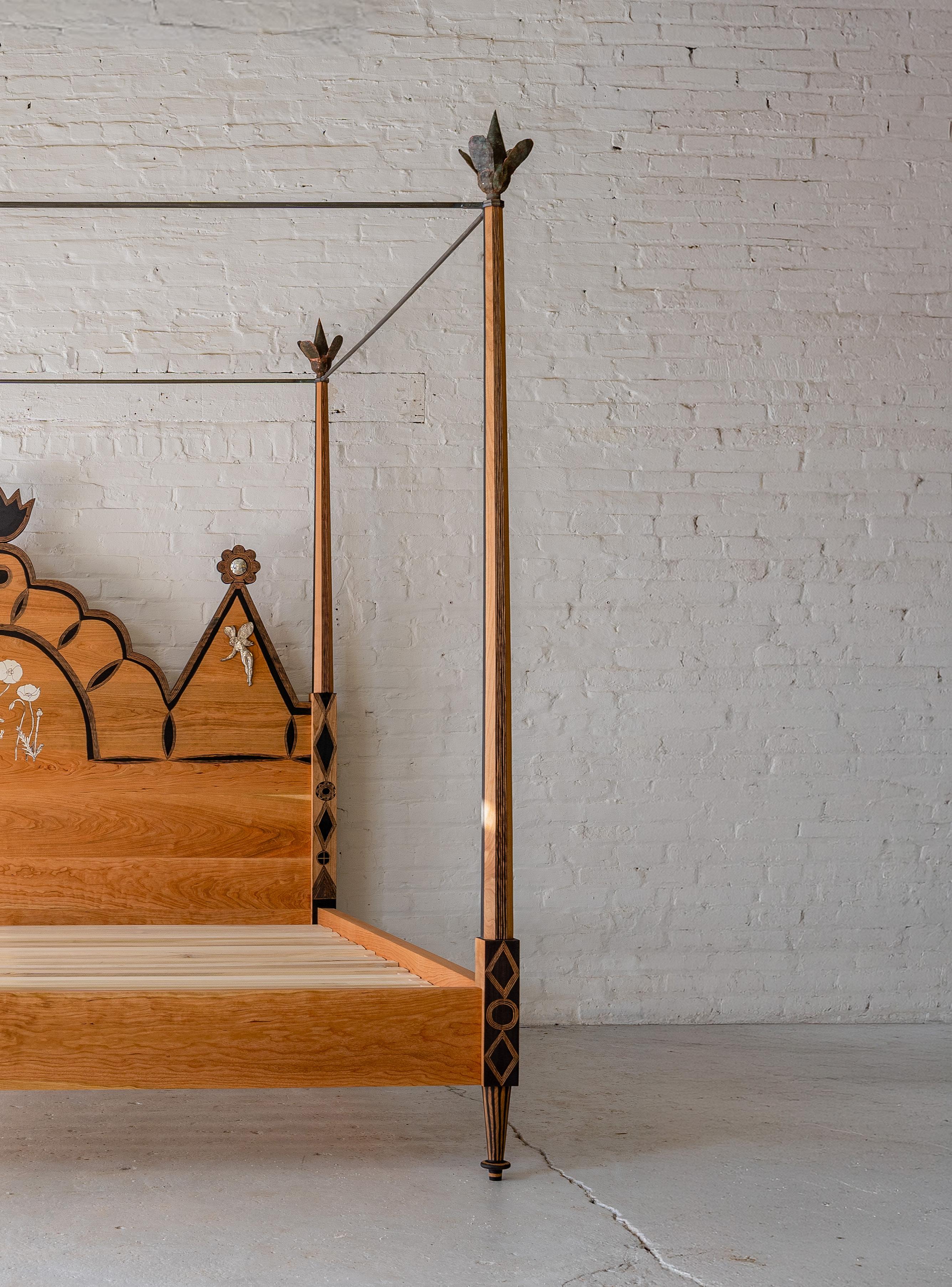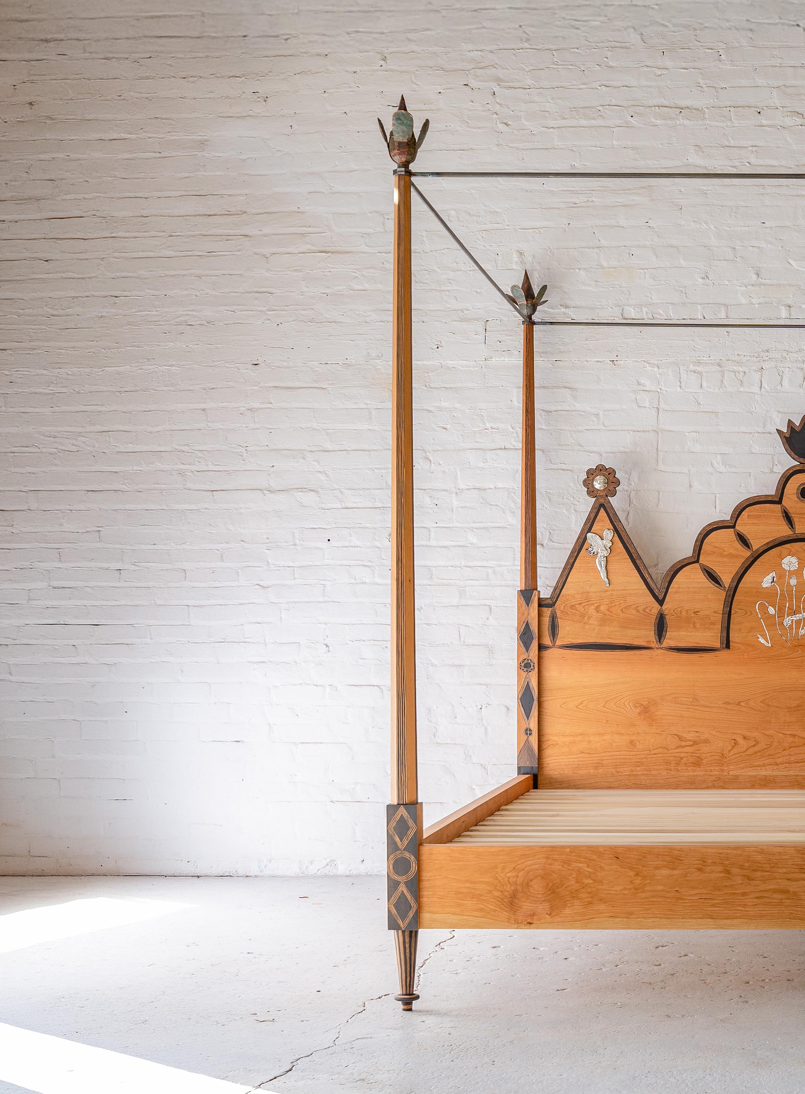 King sized, ebonized cherry with carvings and hammered silver