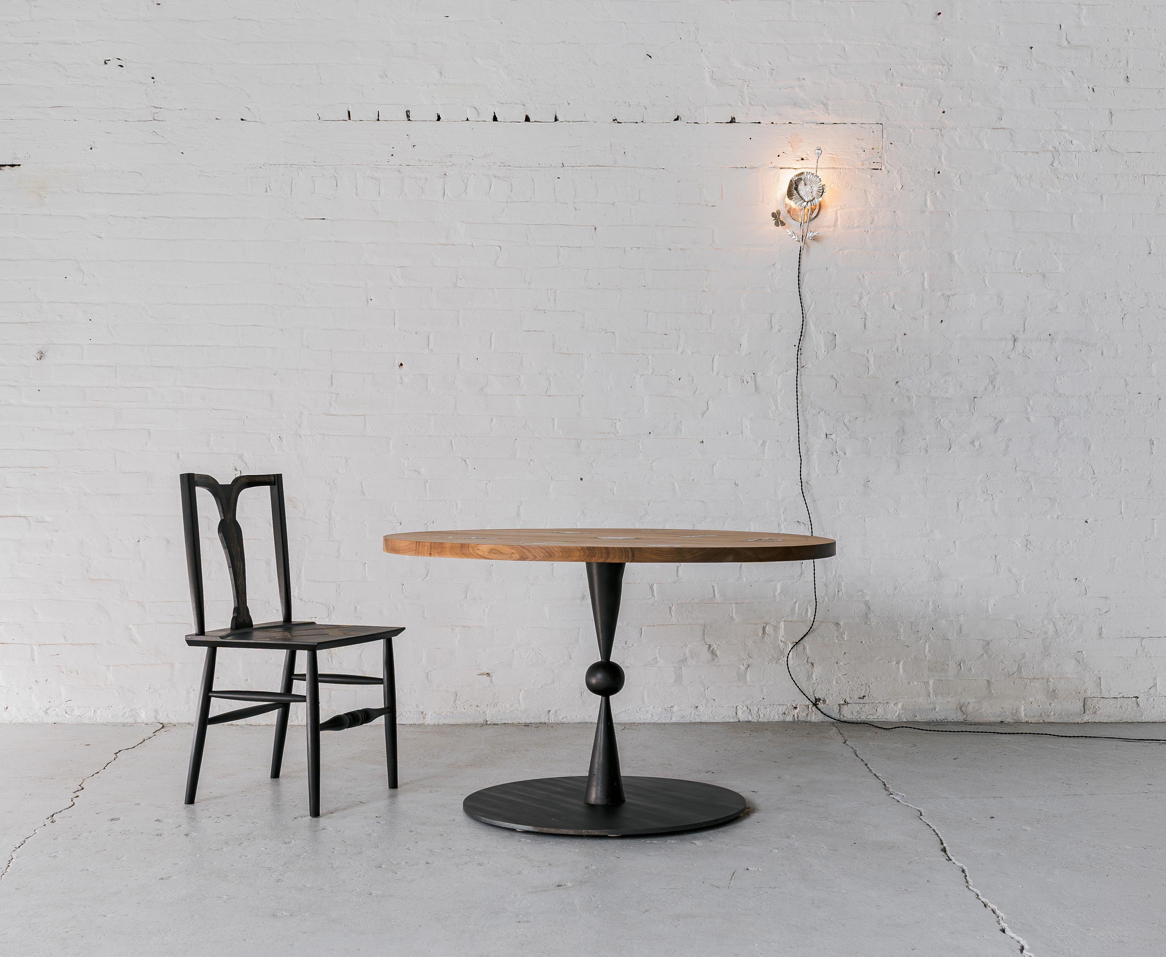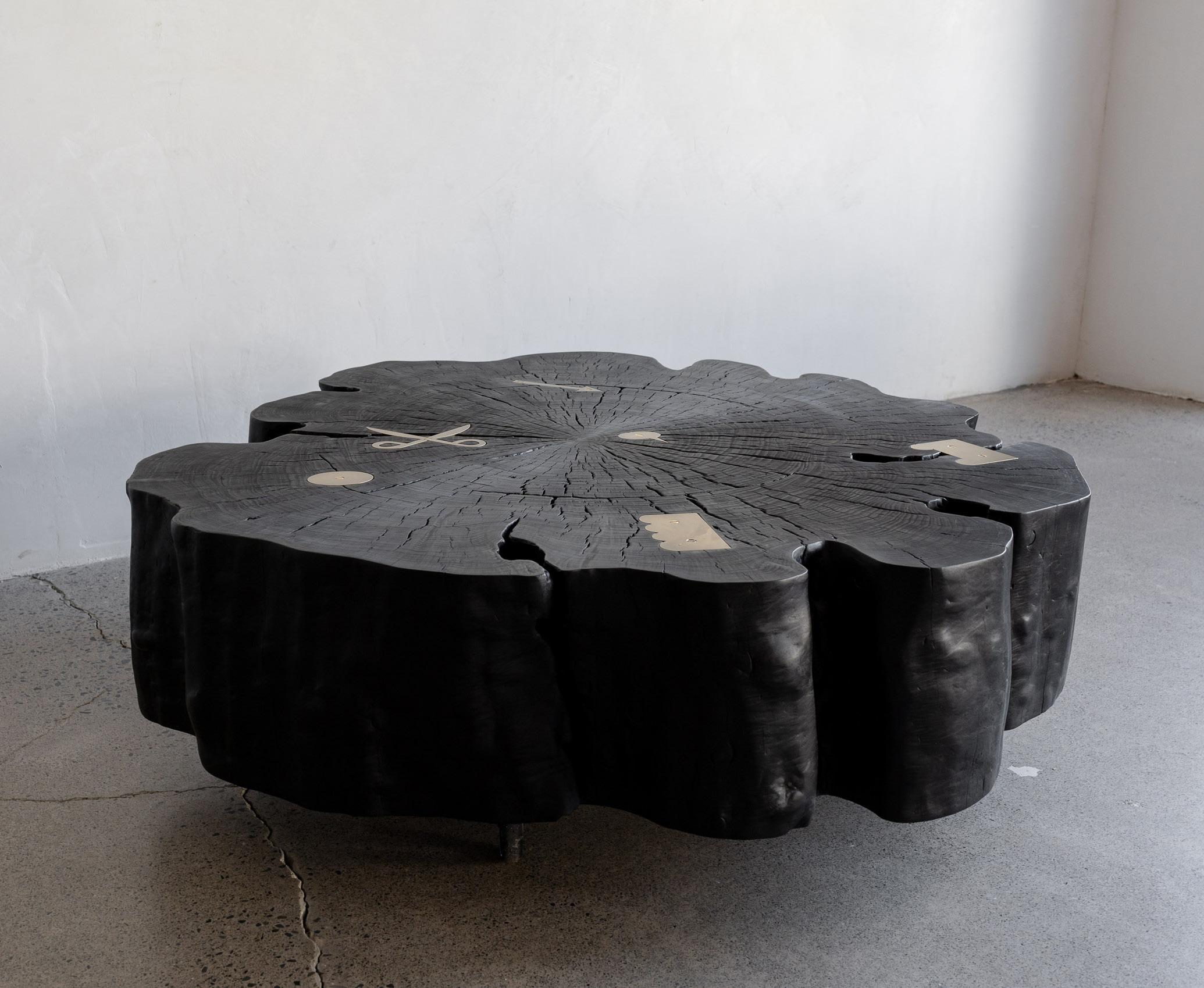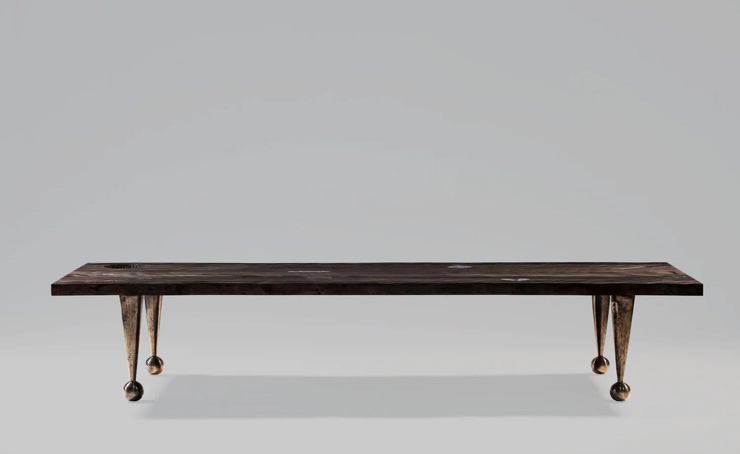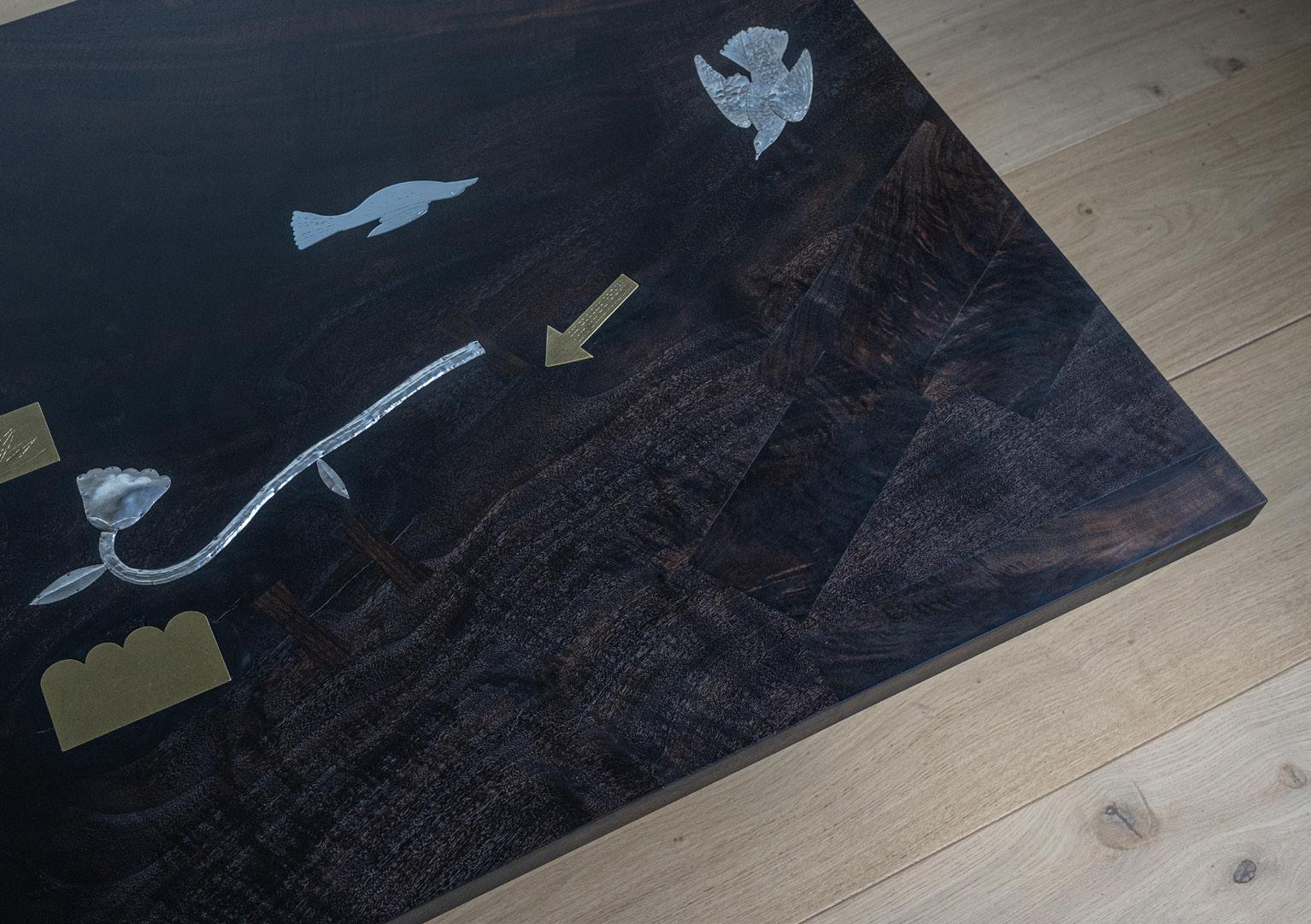 Ebonized walnut, nickle-plated and natural brass, hand-hammered silver and blackened steel