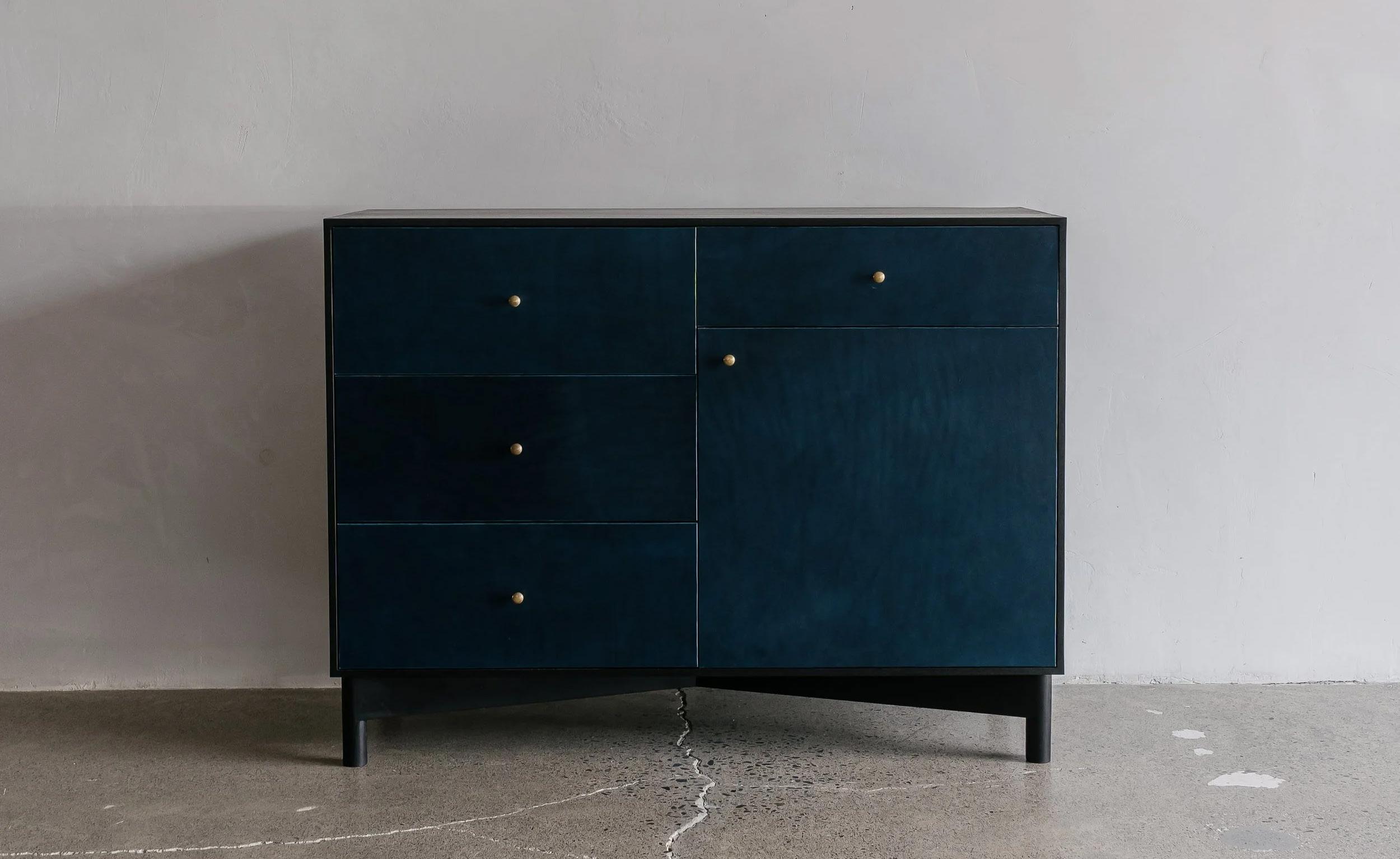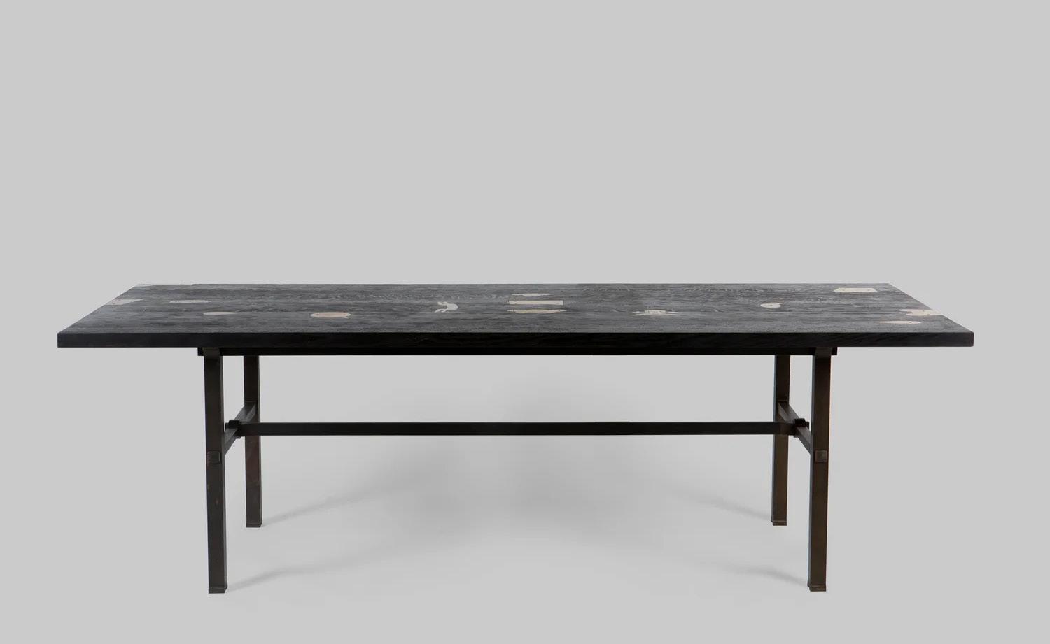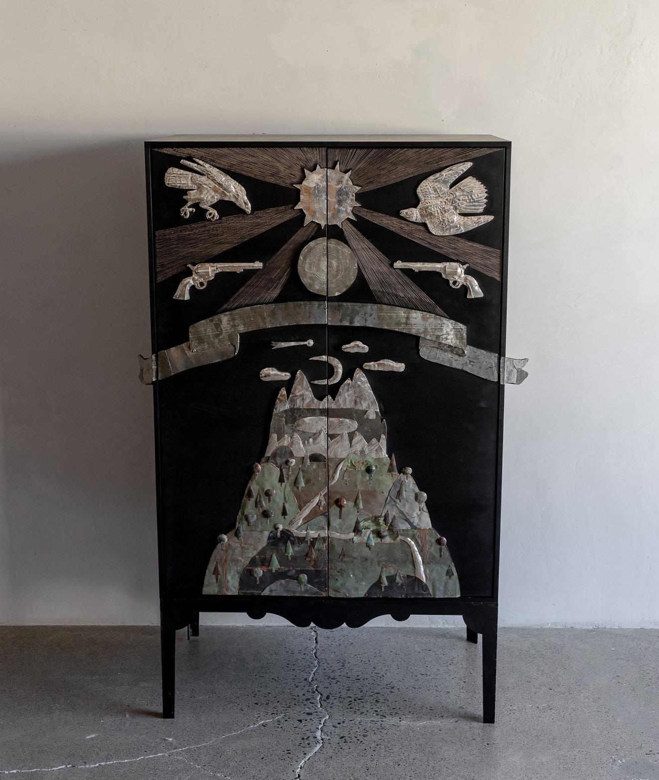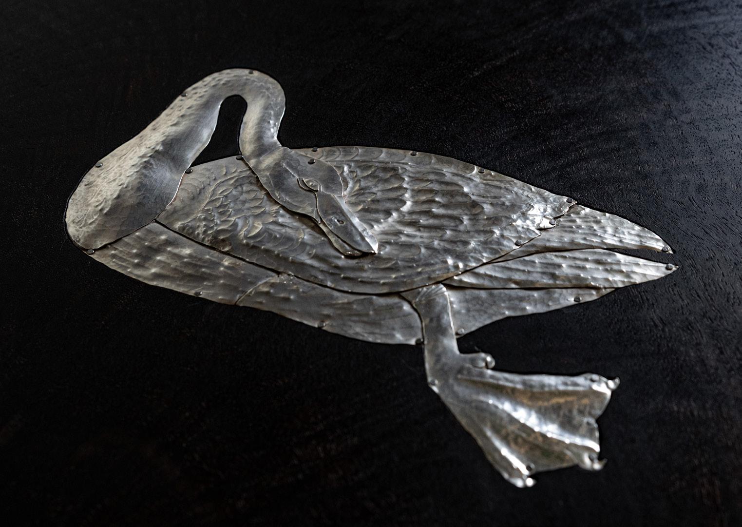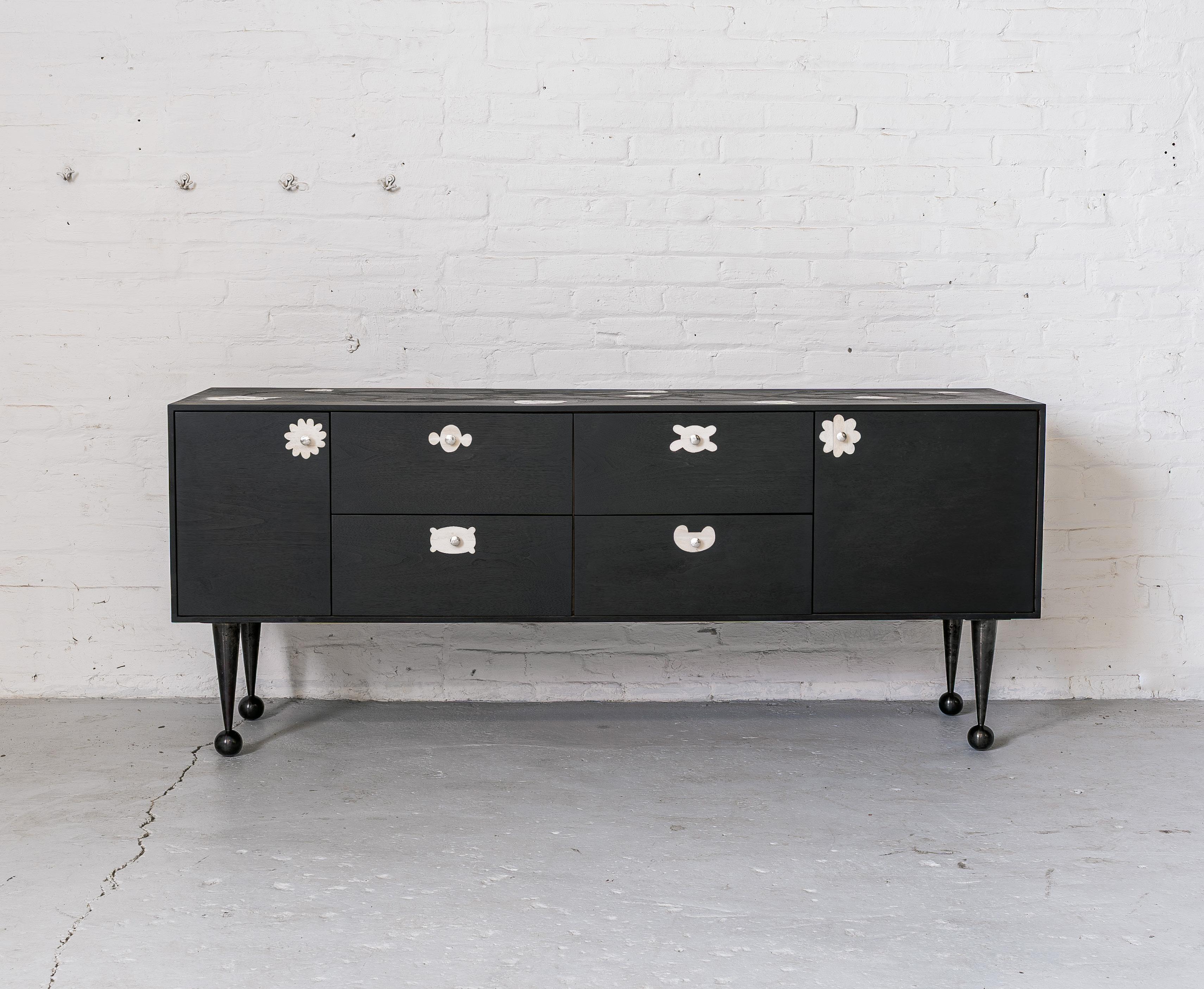 Ebonized walnut, nickle-plated and natural brass, hand-hammered silver and blackened steel