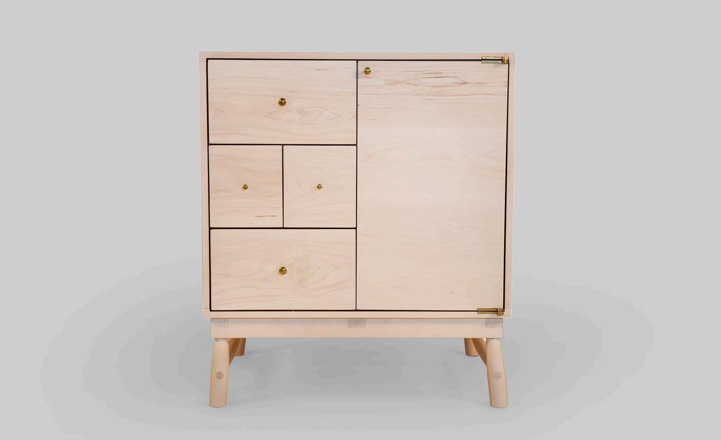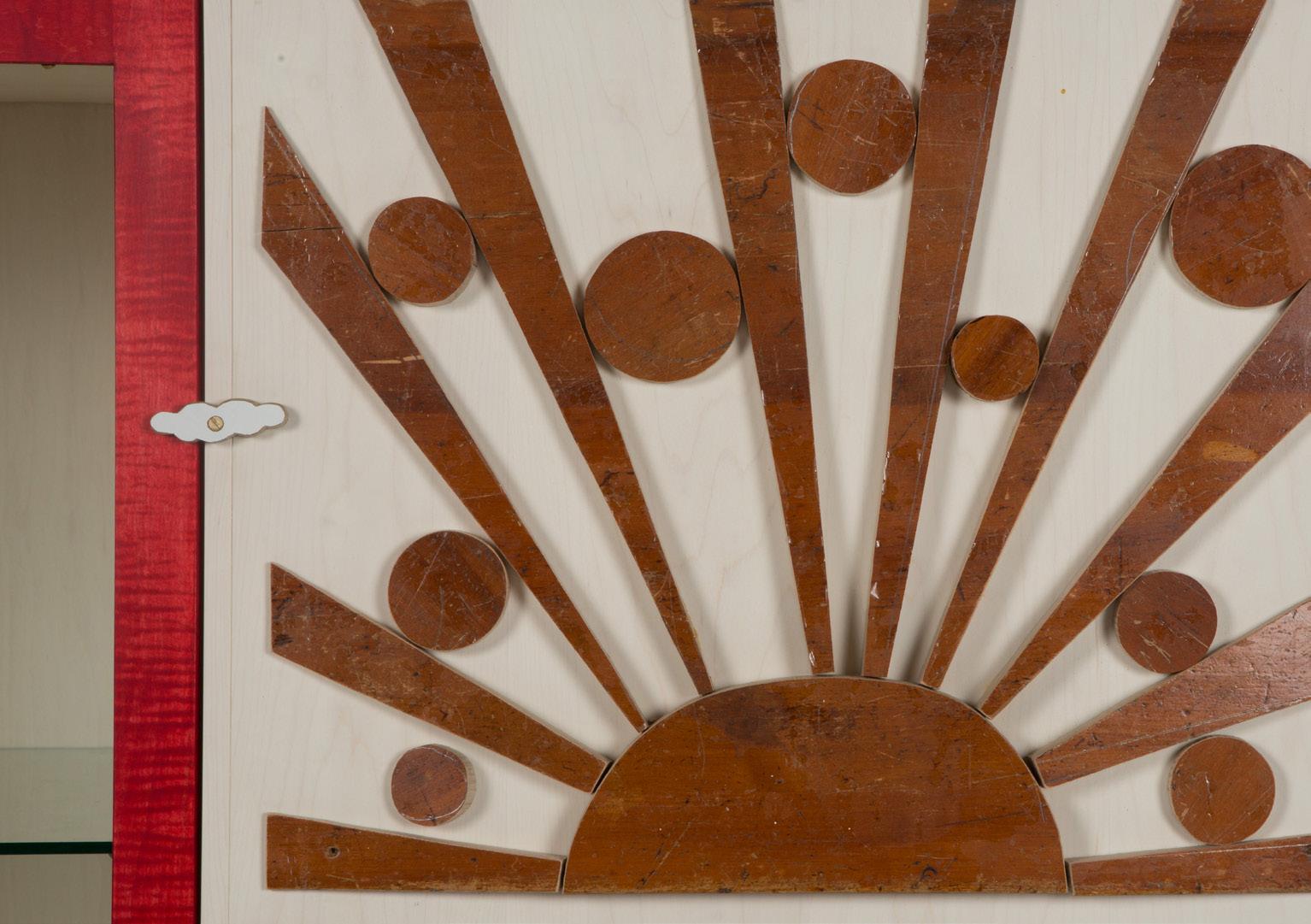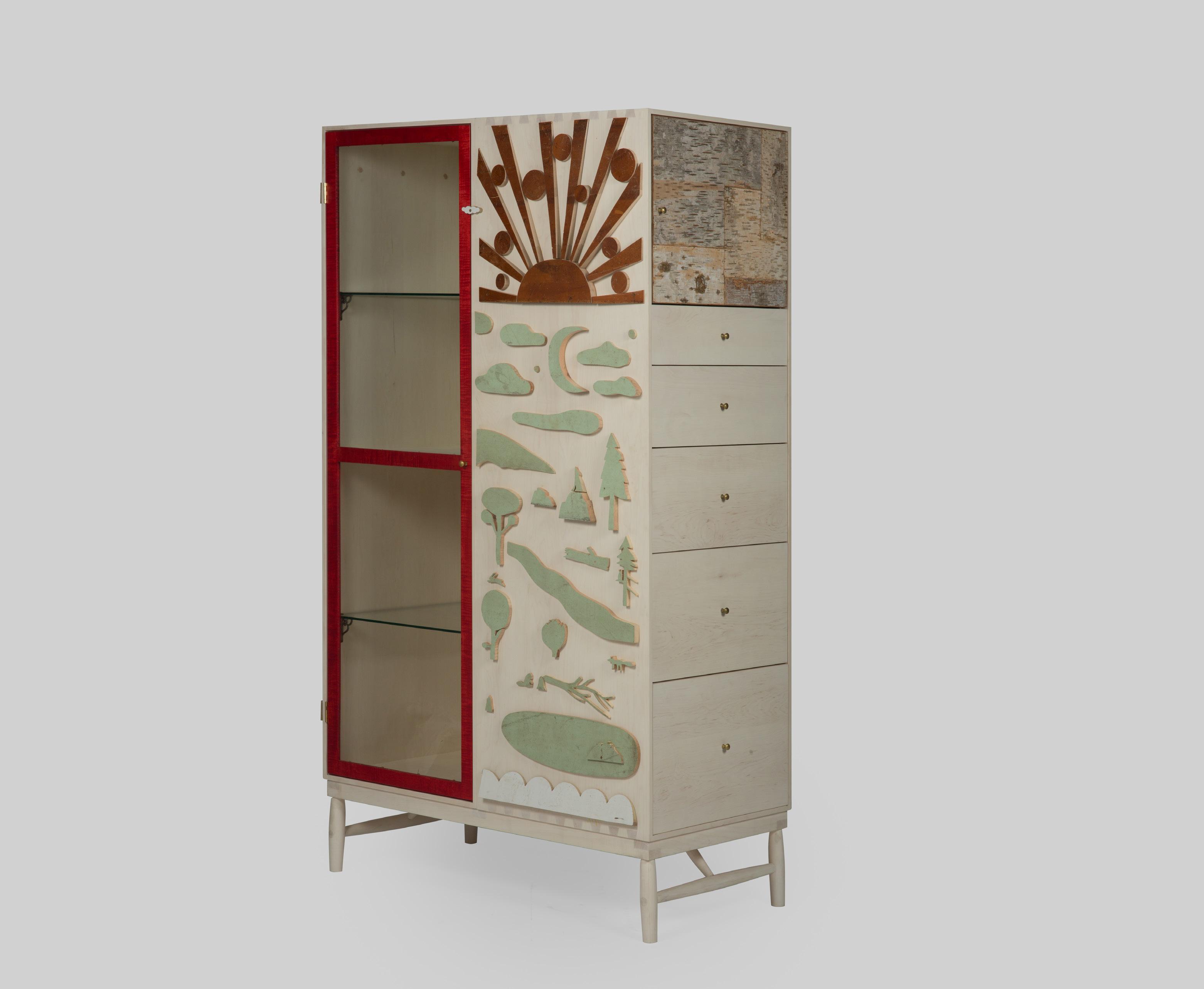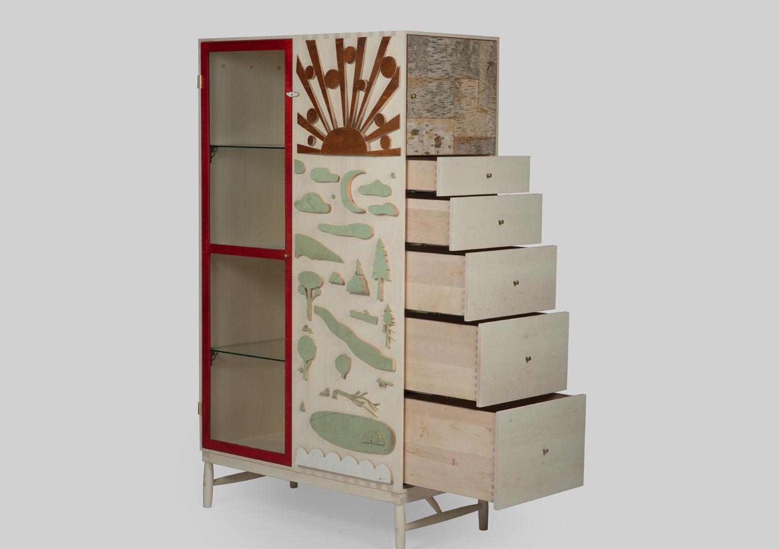 Bleached maple case, vermillion dyed maple trim, birch bark door face wrap and reclaimed wood appliqué