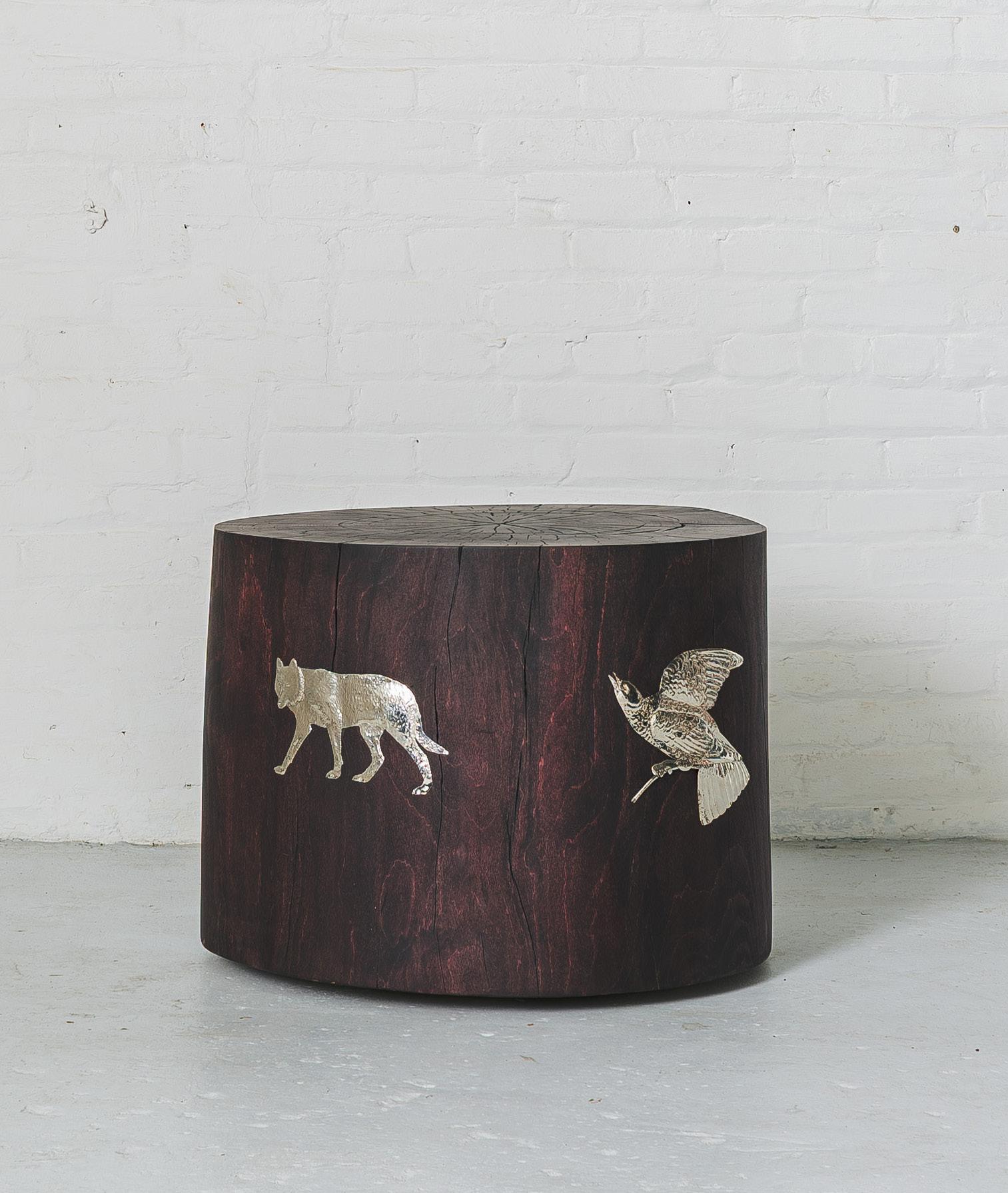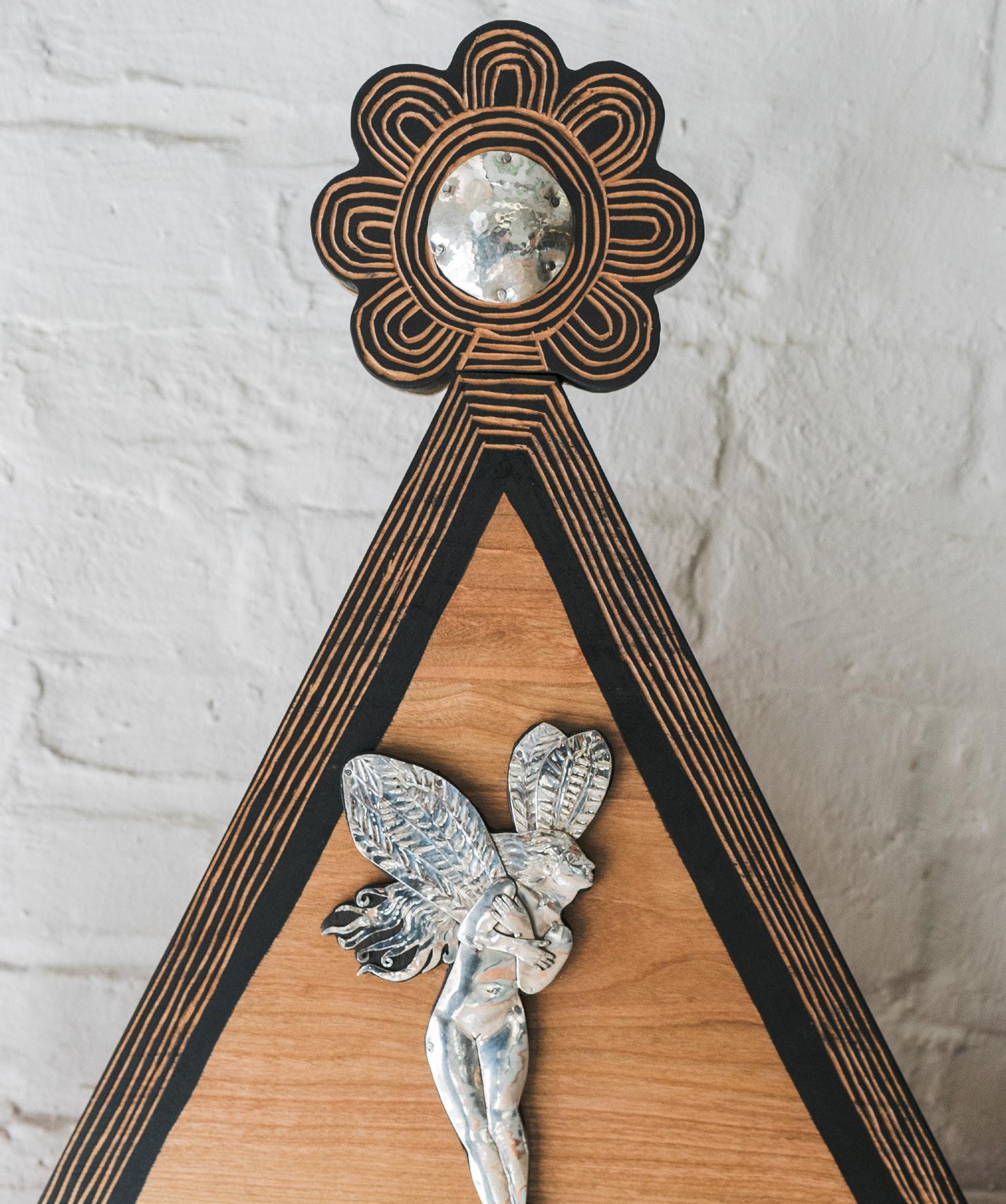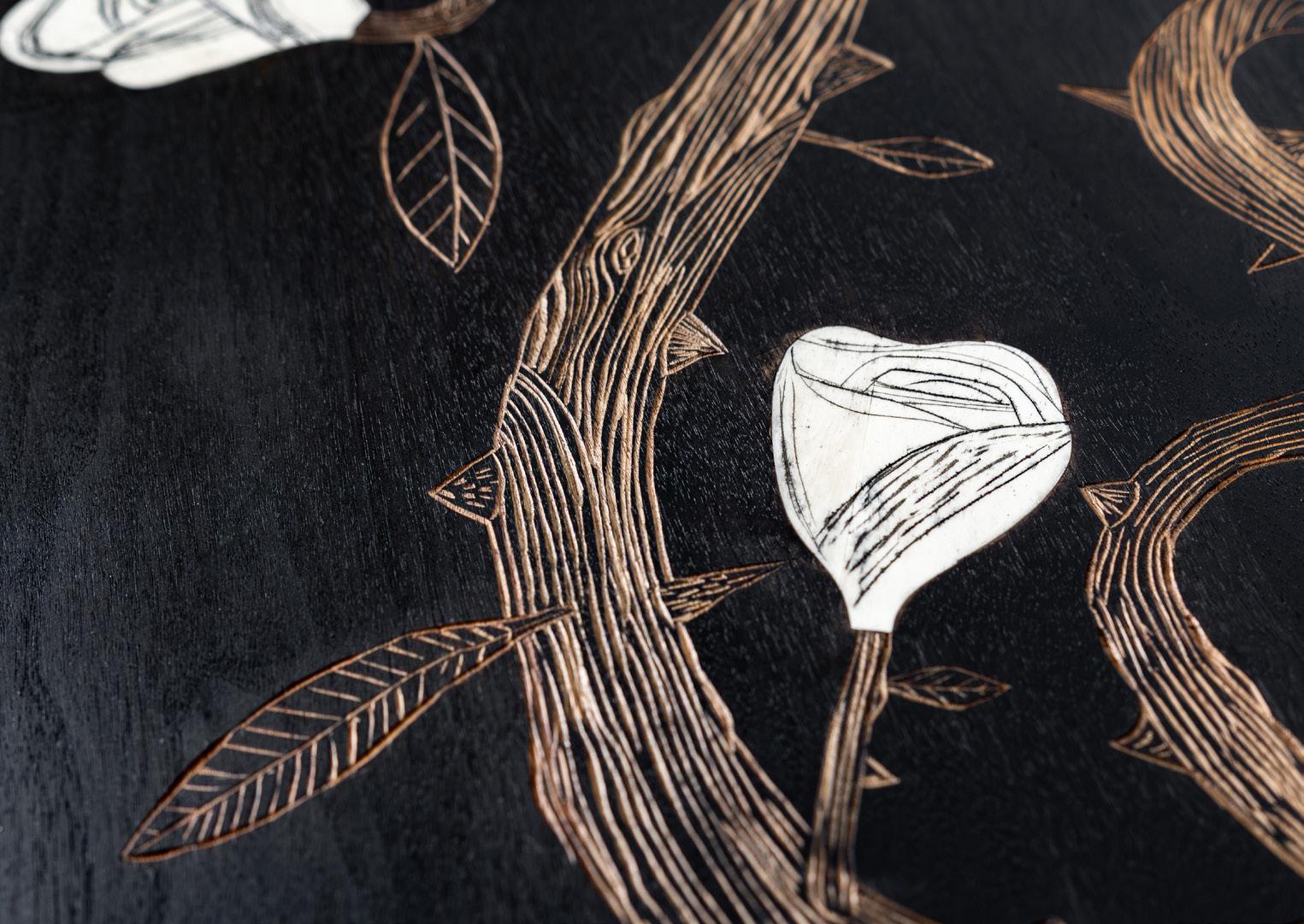 Oxidized cherry with silver leaf, hand hammered silver and carved detailing