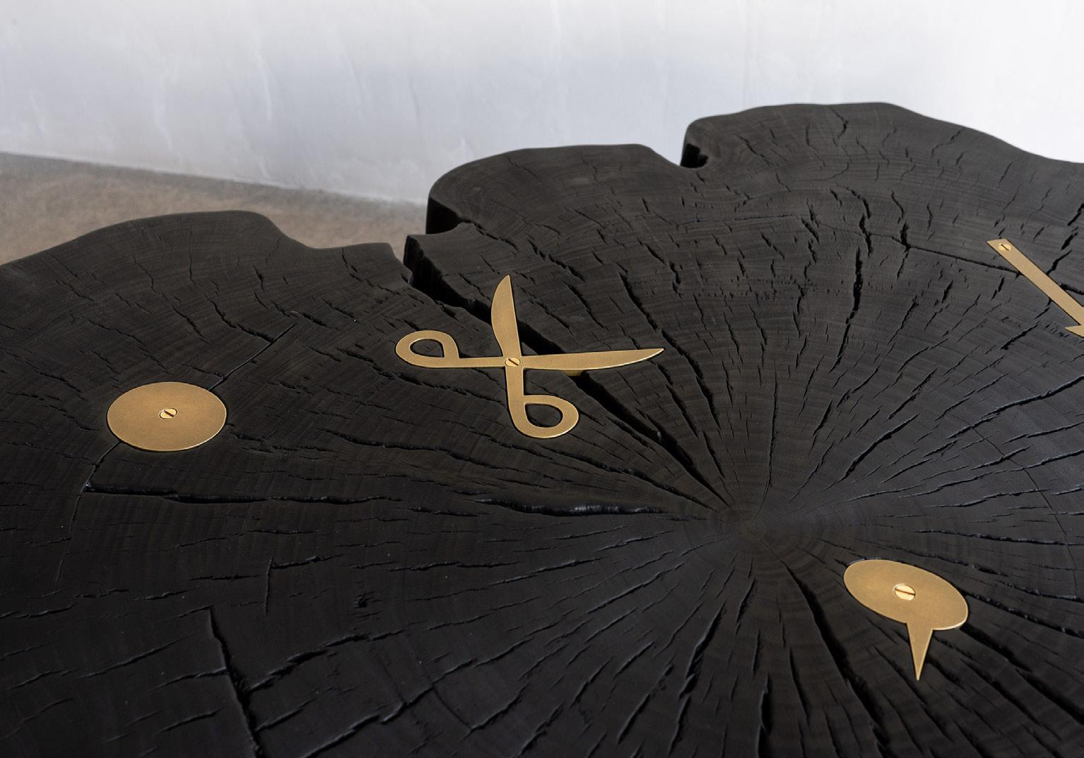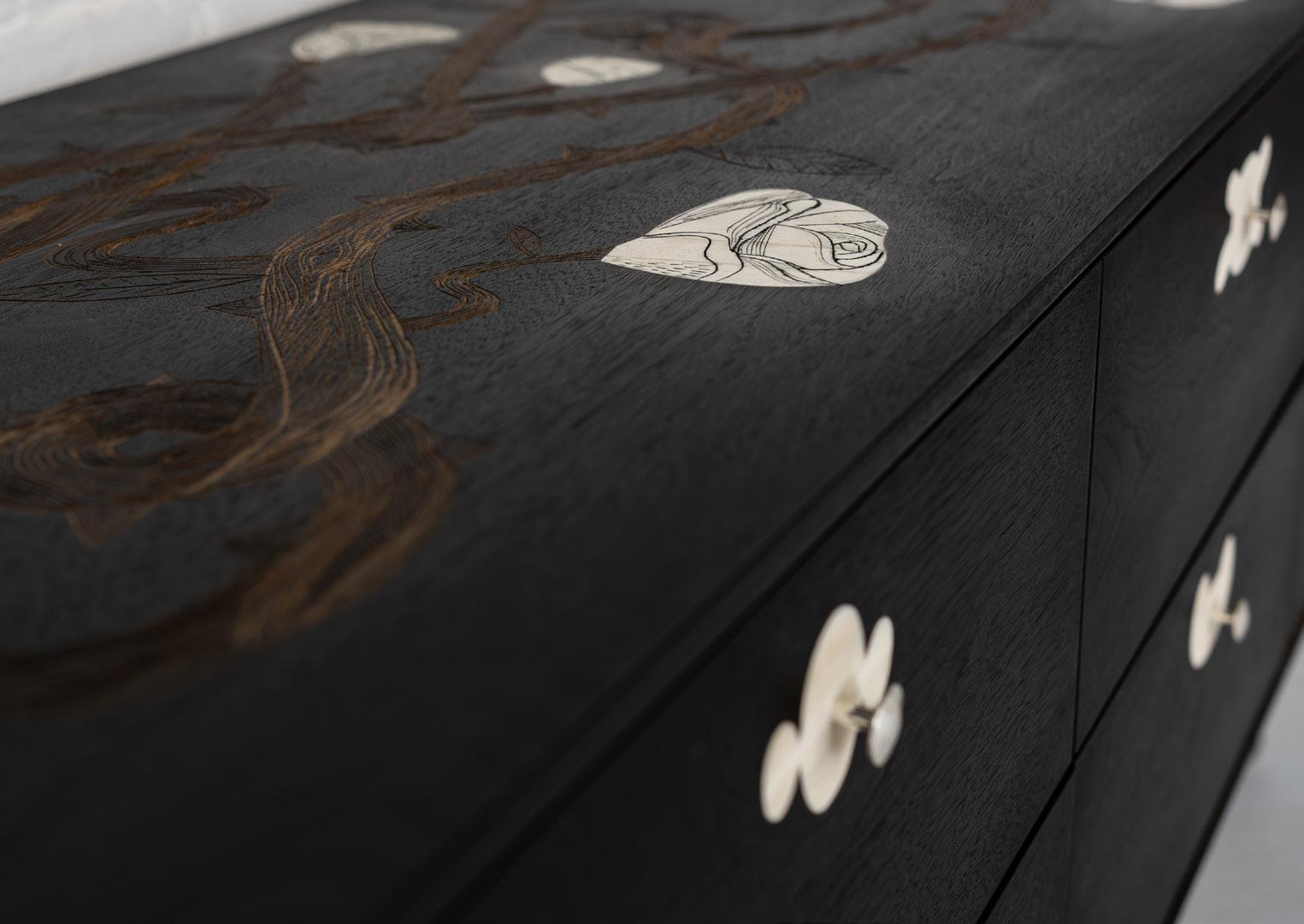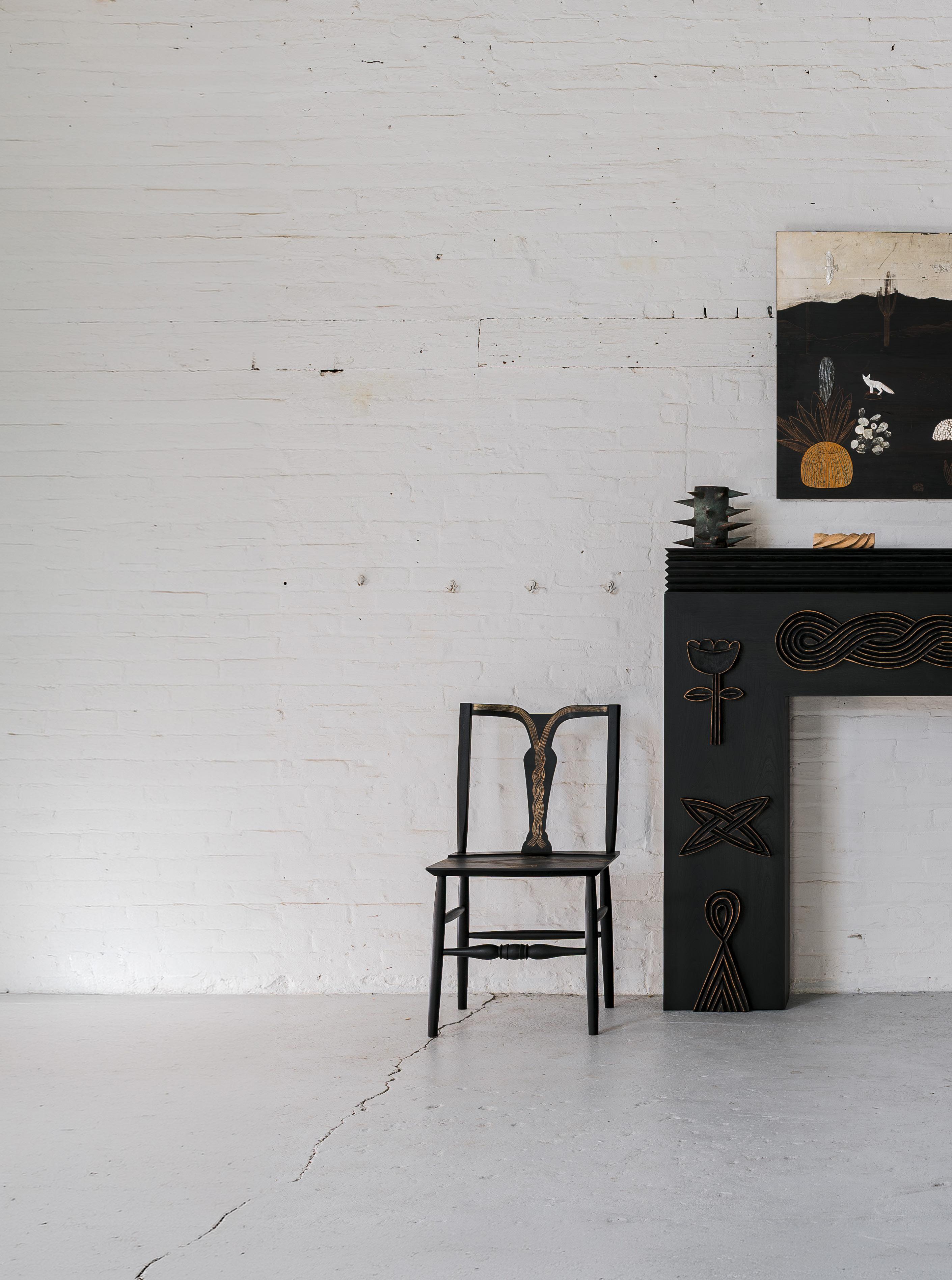 cohesion across furniture, objects, and sculpture. Nature-derived references mingle with playful, almost folkloric elements, resulting in a visual language that feels both grounded and animated. Initially emerging through decorative interventions on functional forms, Meyer’s artistic practice has evolved into freestanding sculptural objects that comfortably occupy the space between design and fine art. The distinction between these categories is intentionally blurred, reflecting Meyer’s long-held interest in studio art and his belief that the two disciplines enrich one another. DeLisio is responsible for nurturing this co-creation at every evolution, teasing out Meyer’s natural ability to design and showcasing his work as the creative director of Sawkille.