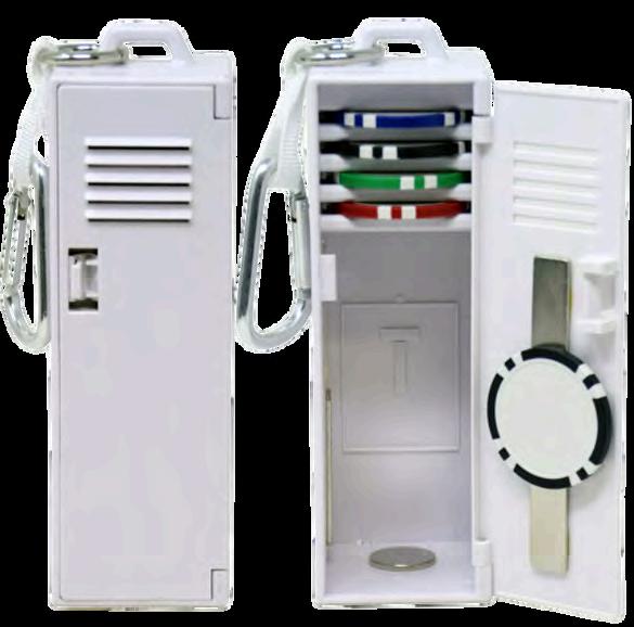 Featuring a carabiner attachment for portability, a secure door latch, a push in/push out mechanism for poker-size markers (ball markers not included)