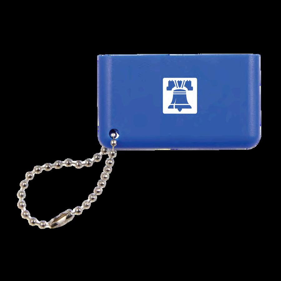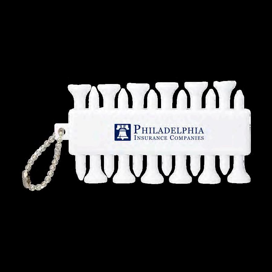 The golf buddy features 12 golf ball tees and 3 golf ball markers in a tee holder on a beaded chain