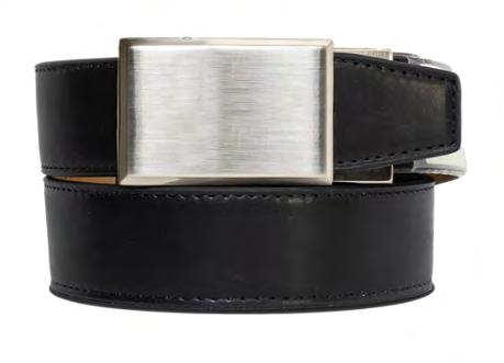 PreciseFit™ Ratchet Belt with leather strap and buckle with brushed nickel finish.