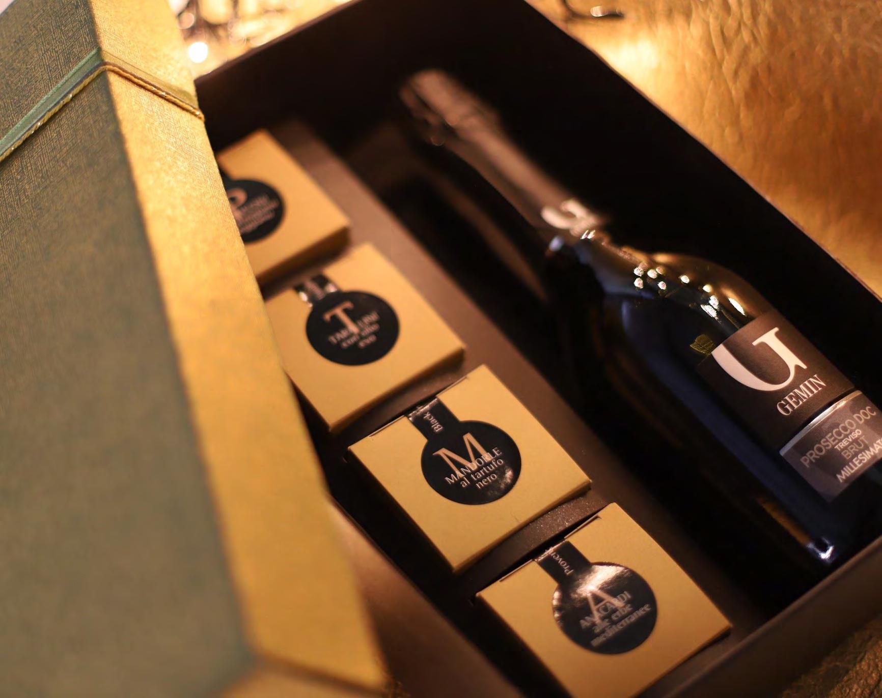 1.Biscuits avec pépite de chocolat noir 60g, Amandes pralinées en pot PET/Aluminium 60g, Gingembre truffé en pot PET/Aluminium 60g, Crème Gianduia aux noisettes 200g, Pralines avec ganache au chocolat Gran Cru avec décorations Design (4 pcs) en boîte Quadra Lux, Prosecco DOC Treviso Brut Millesimato Cantina Gemin 75cl.