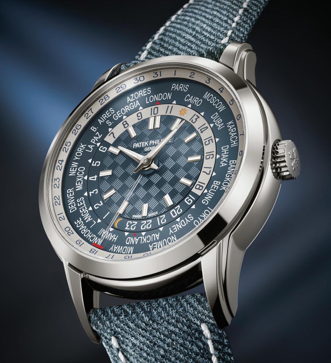 An exceptional watch comprising 355 components, The Patek Philippe launches its new 5330G-001, distinguished by a patented world first: a self-winding 240 HU C caliber with an innovative differential system to manage local-time date. This entire mechanism comprises 70 components. The opaline blue-gray dial features a carbon-patterned center. A red dot between Auckland and Midway marks the date-change line on the city disk.