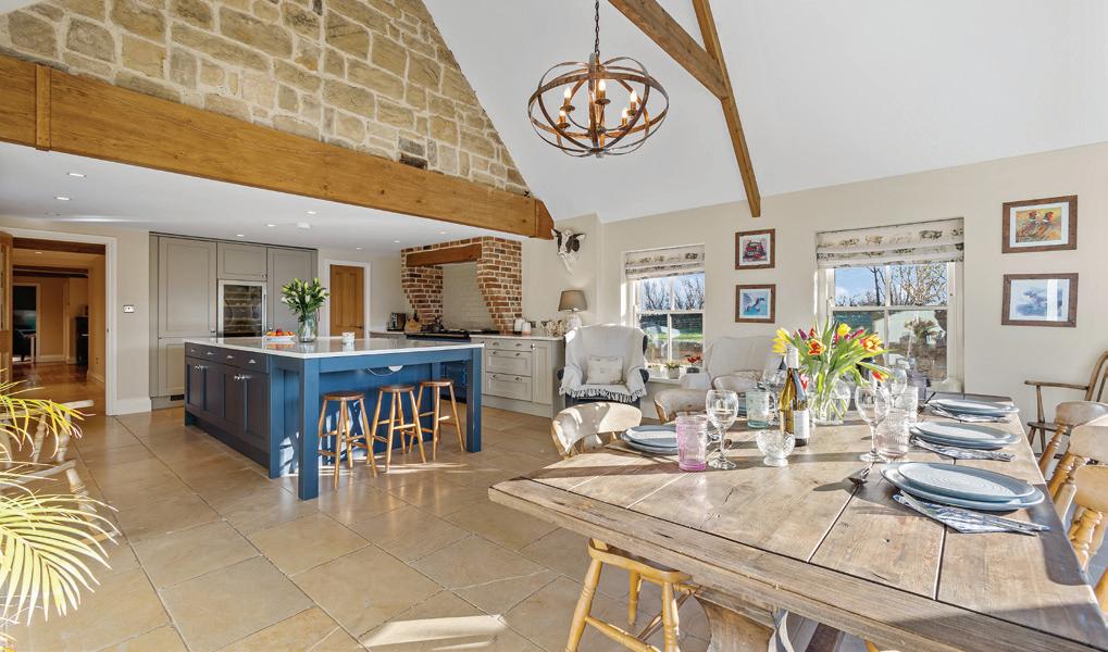 Approached by electronically operated oak entry gates into a sweeping driveway, this magnificent home sits comfortably within its own beautiful landscaped gardens and glorious woodland of approximately 4 acres. Originally built c1850, the property has been sympathetically redesigned and extended. Using the highest quality materials for the renovation, the expert craftsmanship can be clearly seen in the bespoke design and construction of the building. One is immediately drawn to the spectacular vaulted ceiling in the main living area, which is a masterpiece of green oak frame construction. Limestone tiled floors, with underfloor heating throughout ensure a seamless transition through the full height glass bi-fold doors, to the beautiful terraces and gardens.