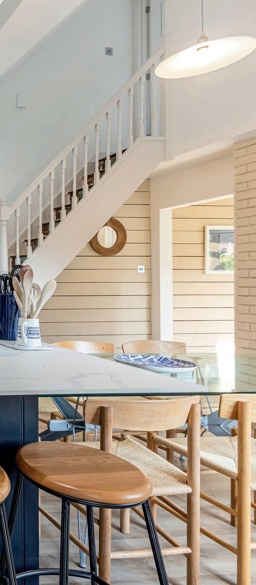 Panelled walls and a neutral colour palette accented with natural materials lends an air of New England style to this family home in Salcombe.