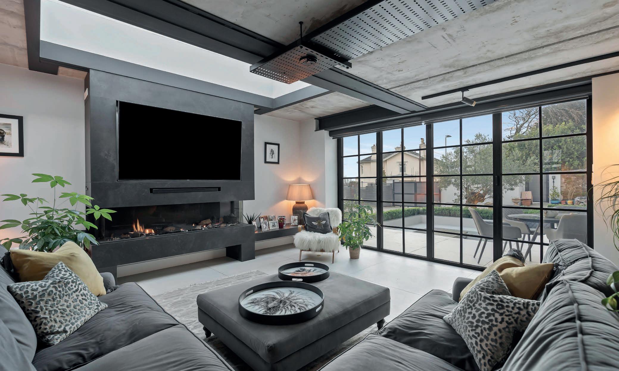 The hands-on approach to designing this striking detached house has created a property of over 2,000 sq ft, filled with an artistic array of industrial materiality and dancing light within. Injections of both natural daytime light and clever lighting as dusk falls create a palette of ever-changing illumination at all hours. Exposed concrete, concealed cabling housed in exposed stainless steel, and lustrous porcelain tiles lift and define the interior contrasts.