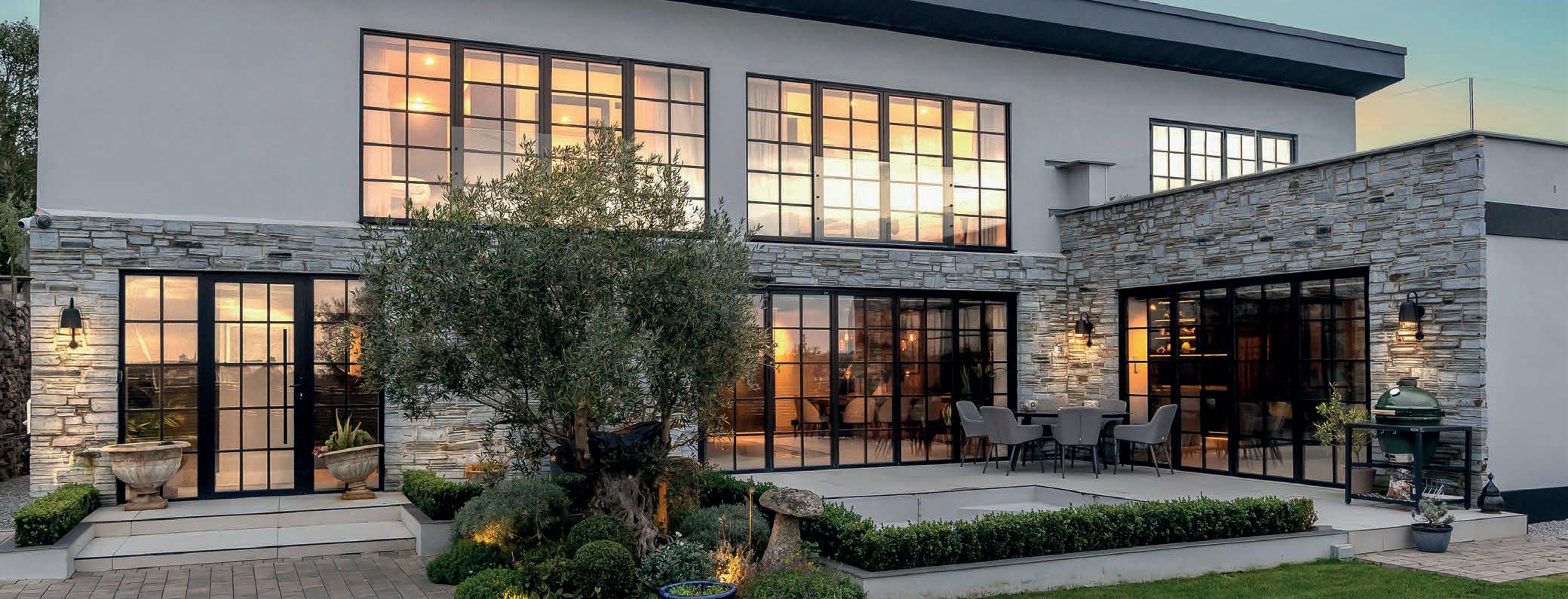 The roadside façade conceals the house from the street scene, electric entrance gates opening to reveal the clean lines of Bunker House and views over the surrounding countryside and cityscape.