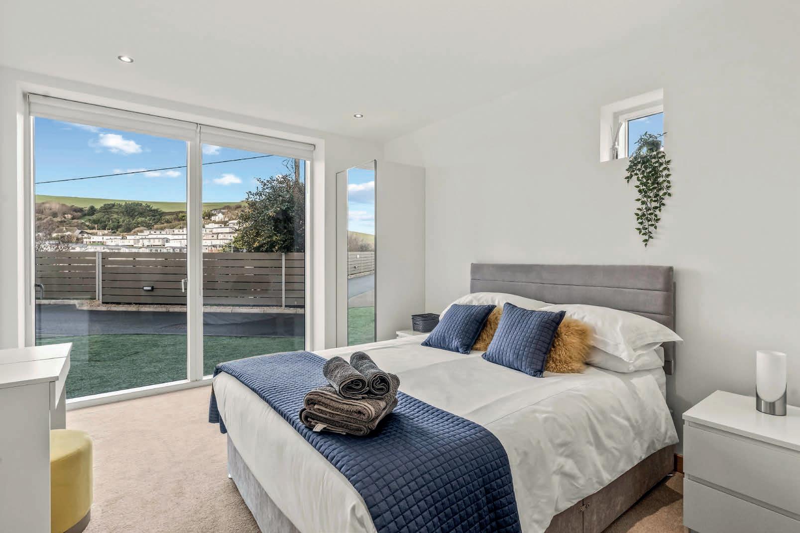 The distinctive and modern home features four double bedrooms, open-plan living and views towards the sea, making it the perfect coastal escape.