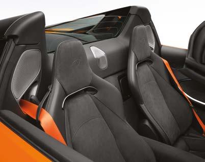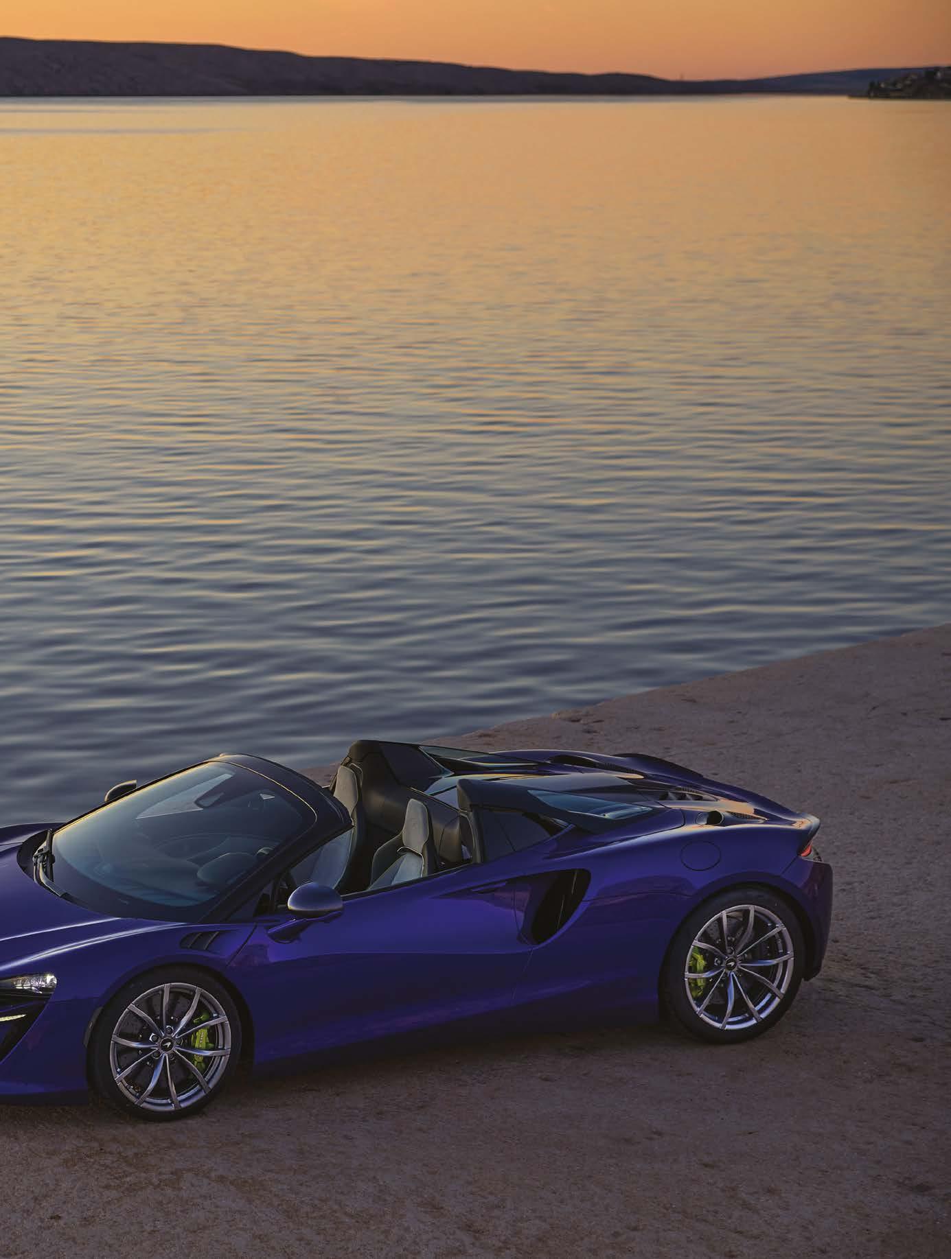 The cabin of the new Artura Spider – trimmed in performance or luxury materials according to the driver’s preference – retains the purposeful, driverfocused design of the coupe. The ‘clean’ steering wheel is free of buttons and controls, aside from the sculpted gearshift paddles which move with the wheel for optimal driver ergonomics. The driver display binnacle, which moves with the column when adjusted for reach or rake to ensure all driving