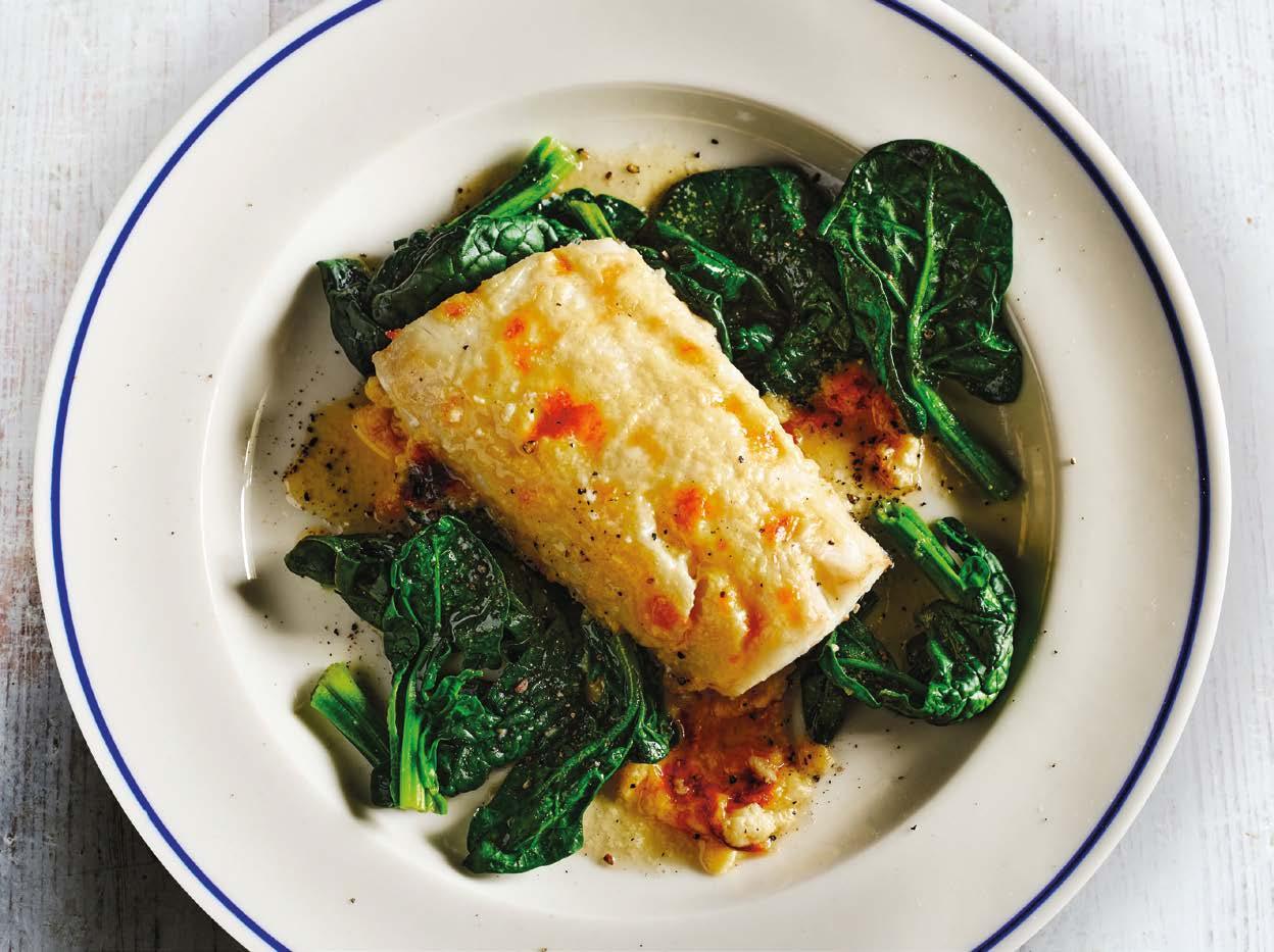 While the haddock is under the grill, wilt the spinach in a pan, stir in the butter and season with salt and pepper.