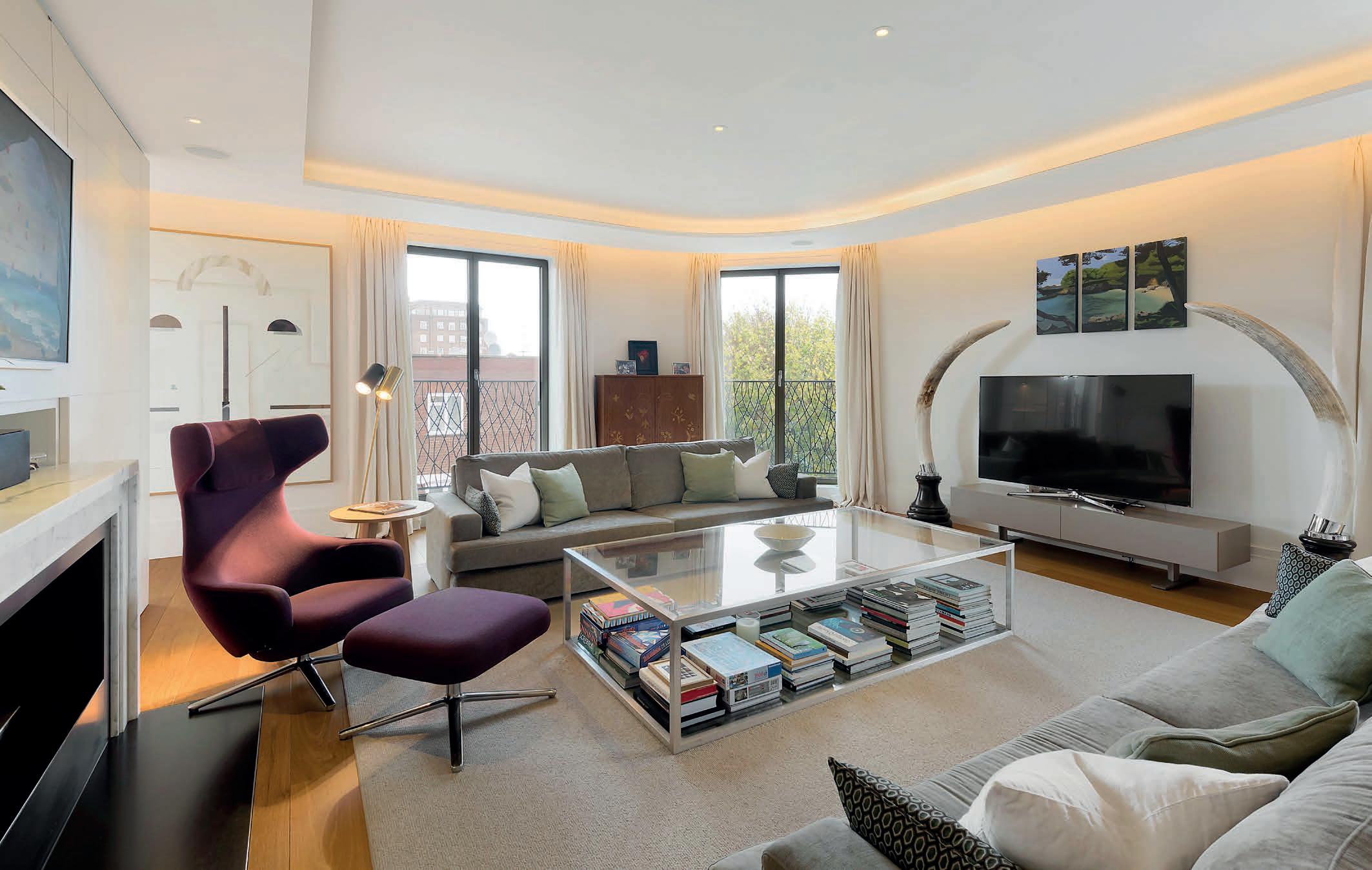 English Oak parquet flooring and soft linen textures throughout provide a sense of warmth, whilst full height doors and oversize windows fill the apartment with light. A generous and bright double reception room with working gas fireplaces and a separate entertainment room are accessed from the entrance hall.