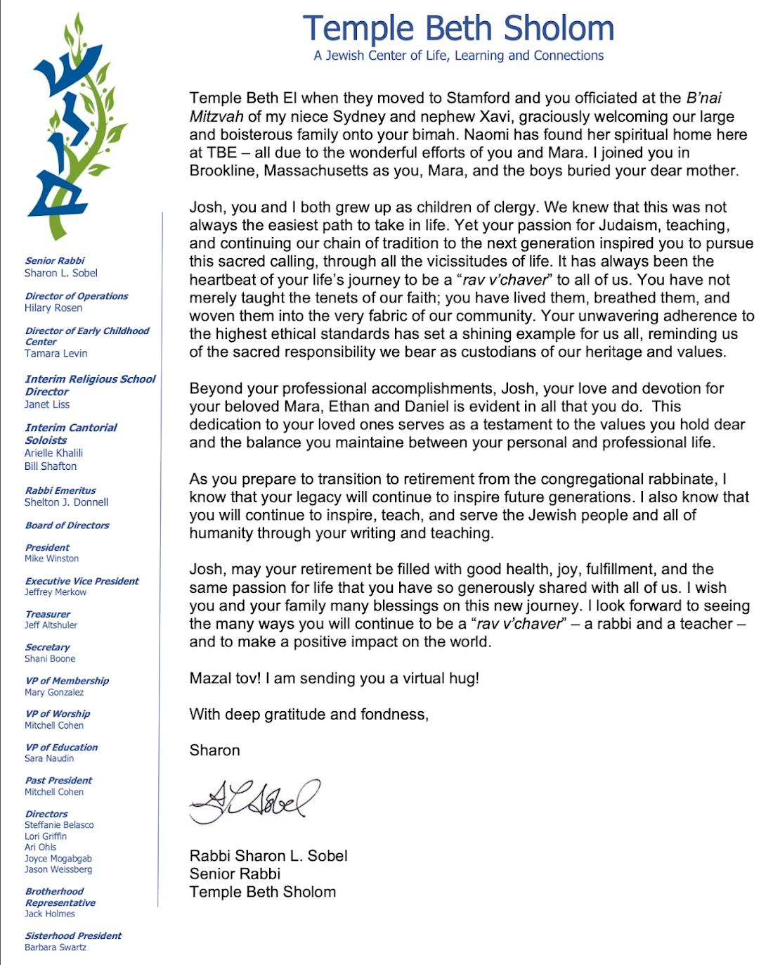 Josh, your retirement is well deserved. You have put an enormous amount of yourself to your congregation and the results are evident. I personally thank you for your welcome of me and allowing me to give the d'var on erev Rosh Hashanah. I hope we can stay in touch, now that you will have (hopefully) some more time! Congratulations - all the compliments are well deserved!