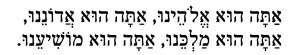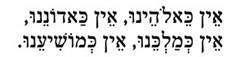 Ro-m'mu A-do-nai E-lo-hei-nu, v'hish-tacha-vu la-ha-dom rag-lav: "Ka-dosh hu!"