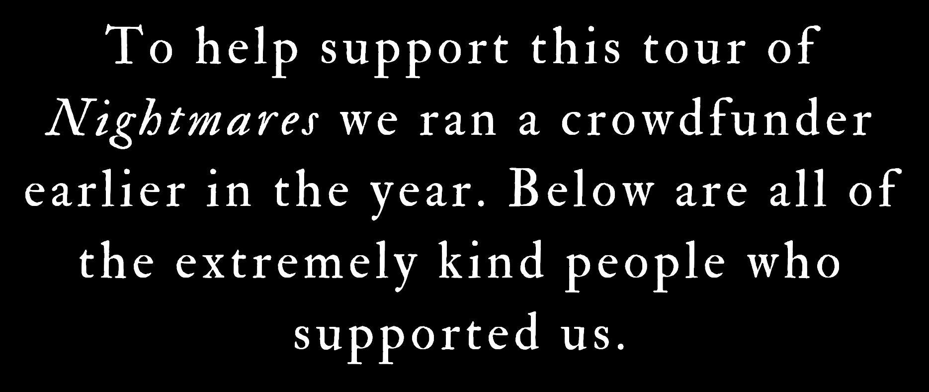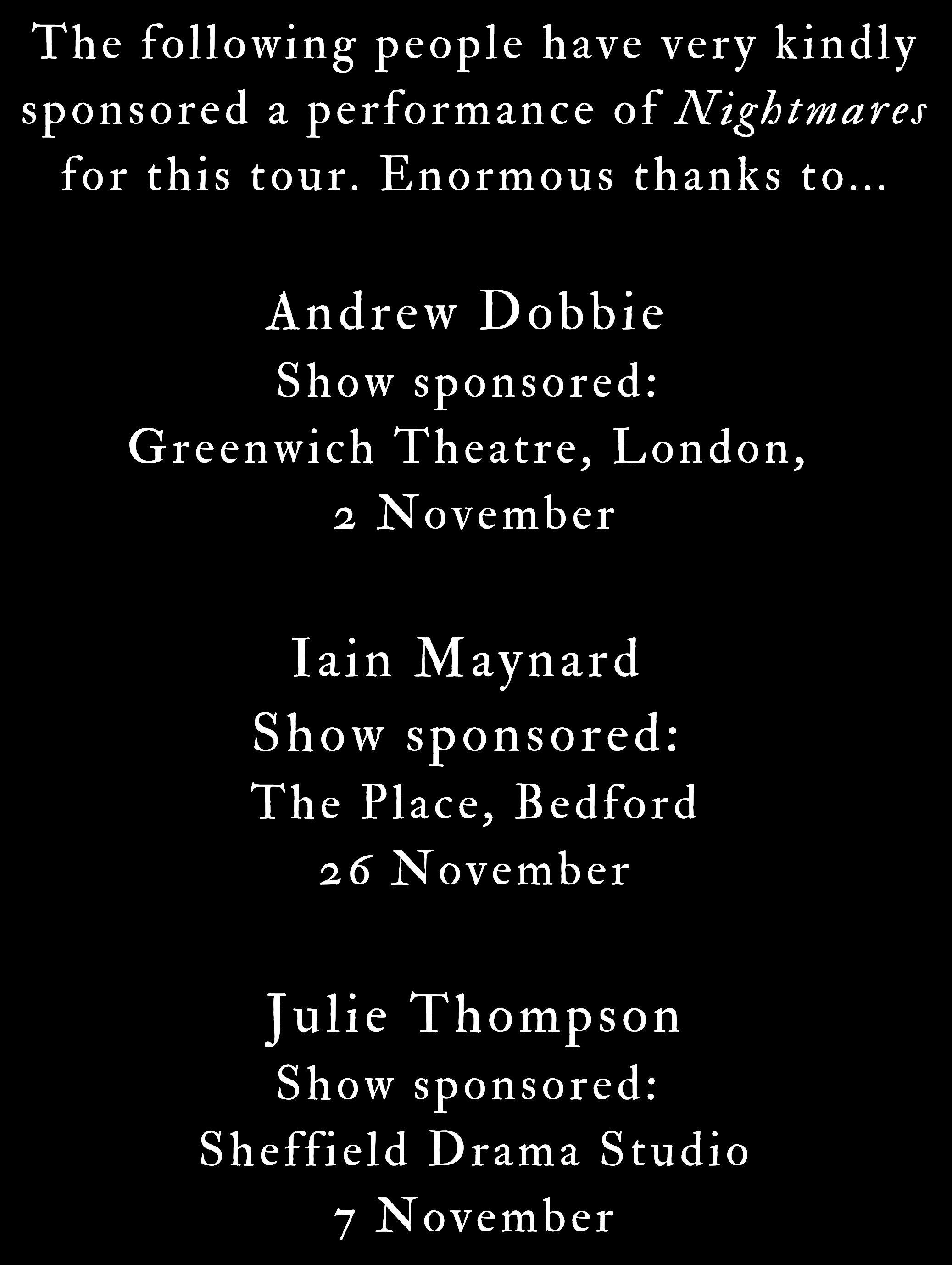 Nightmares is a horror show. It is designed to be scary, tense, jumpy and at times disturbing. We suggest that it is not suitable for anyone under 14 years old, and responsibility for anyone under the age of 18 years old lies entirely with parents/care-givers.