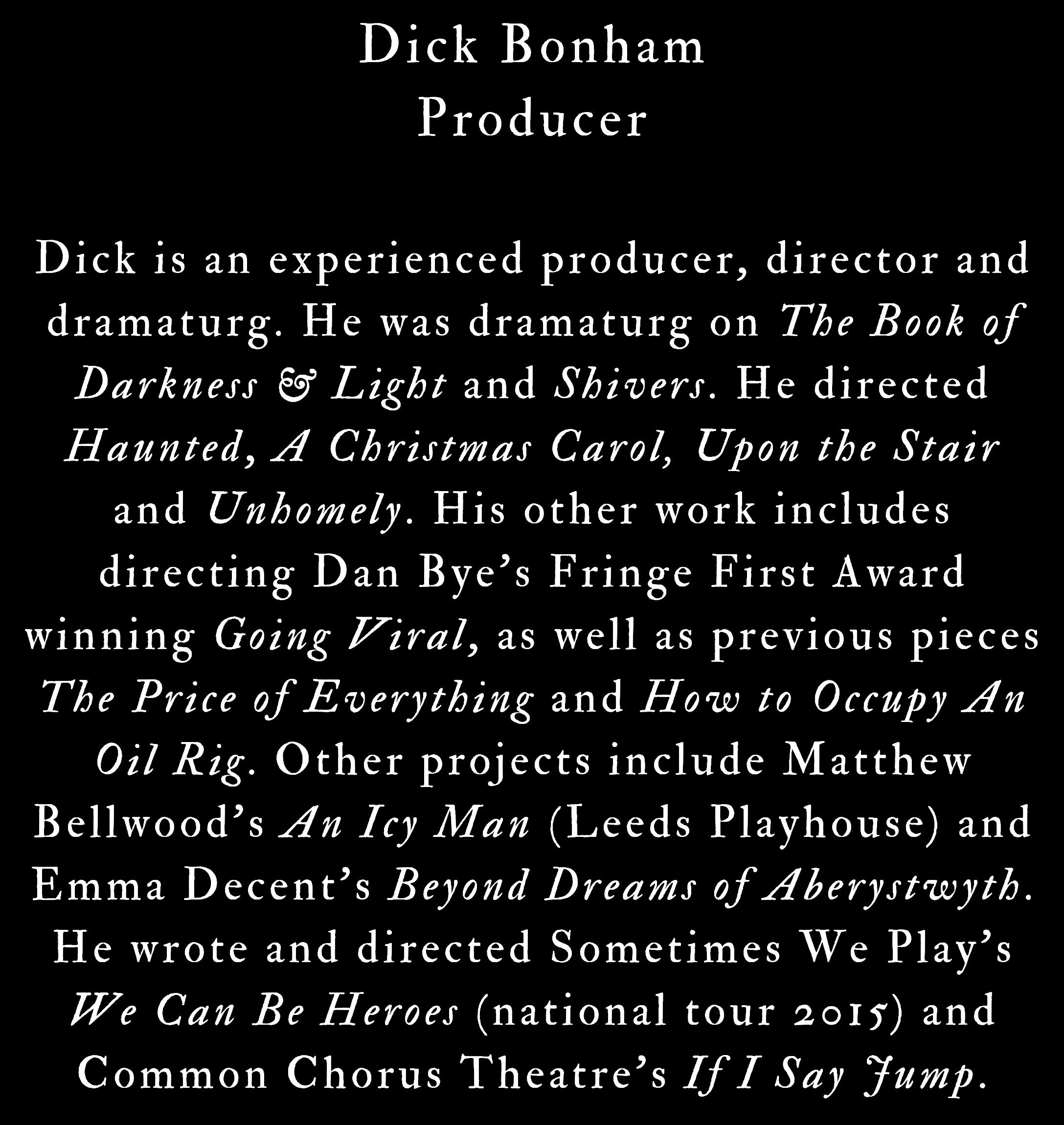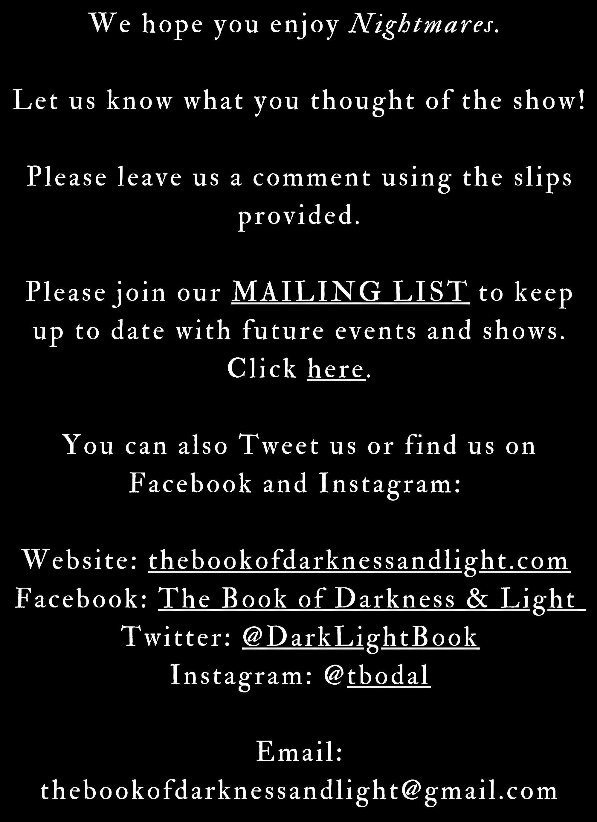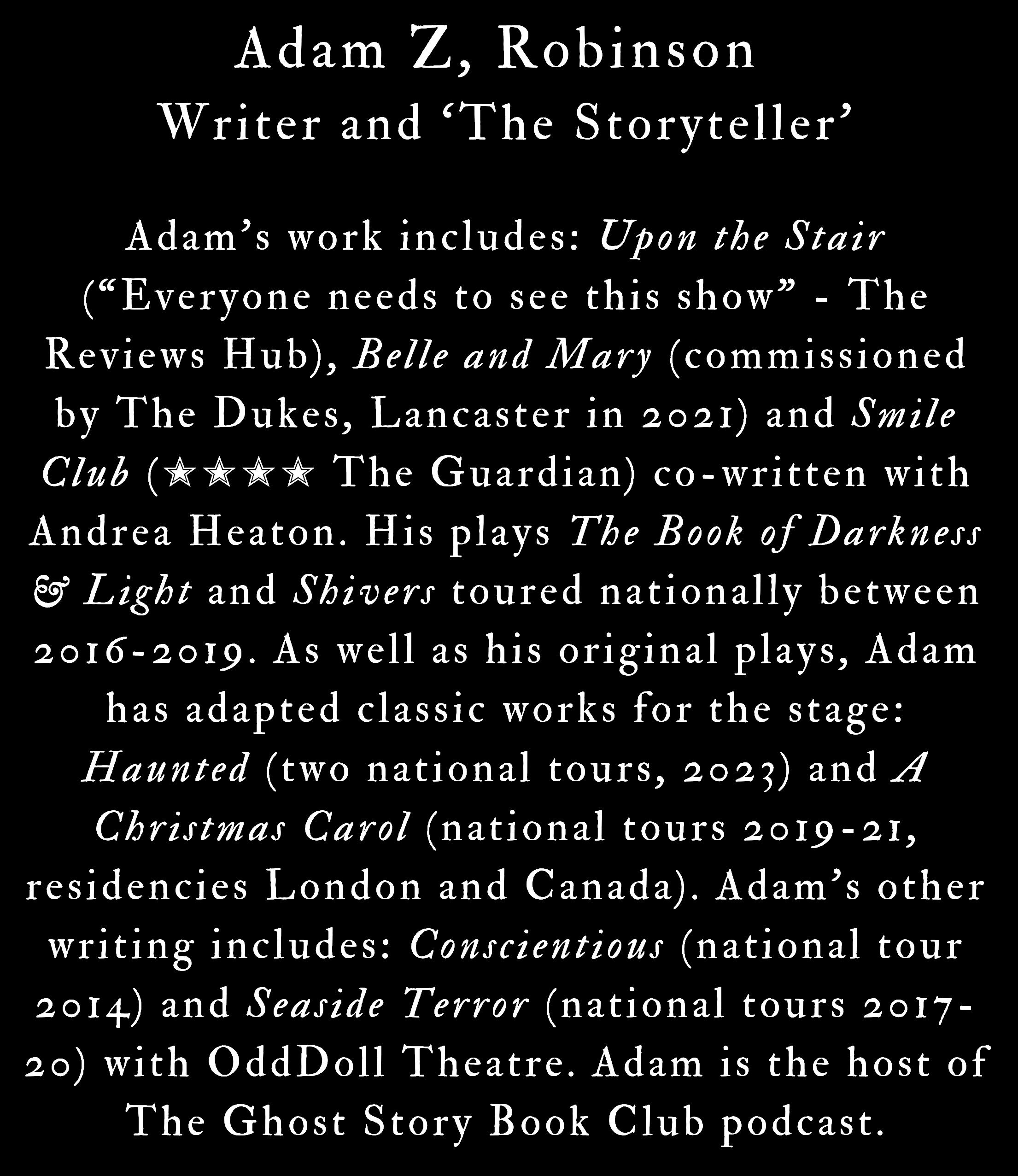 The Book of Darkness & Light was co-founded by writer/actor Adam Z. Robinson and musician Ben Styles in 2015. After their first performance at Light Night Leeds, the company have gone on to tour seven ghost story shows nationally. The Book of Darkness & Light, Shivers and Upon the Stair are all published by Playdead Press. TBODALās work has been performed in the UK, Canada and Australia. Upon the Stair and Unhomely were produced as bi-lingual shows, presented in spoken English and BSL (British Sign Language).