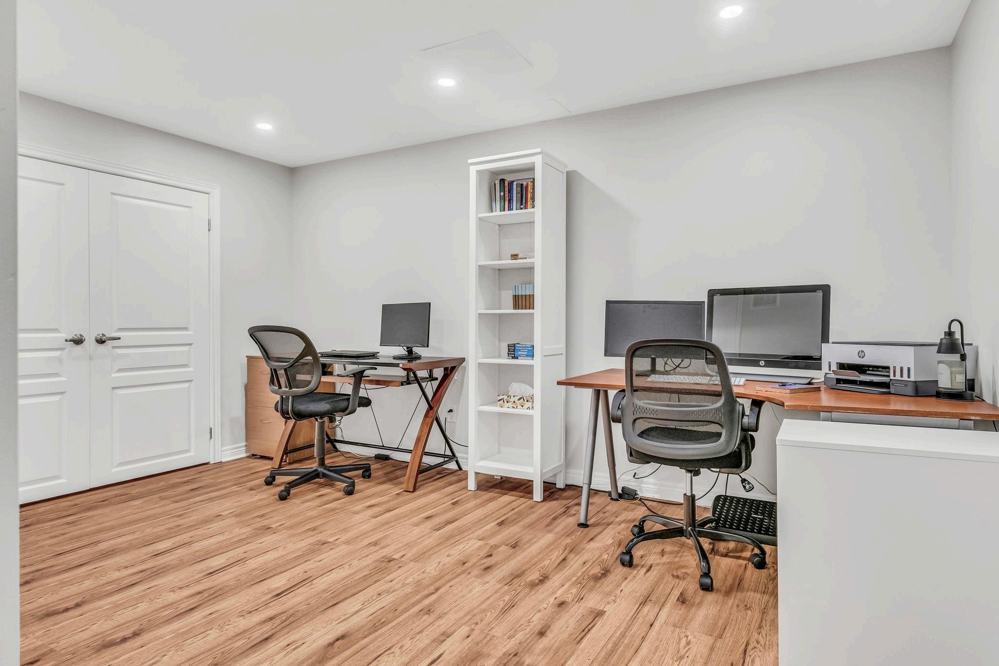 Upstairs, you'll find four generously sized bedrooms, including a luxurious primary suite with dual closets and a spa-inspired ensuite featuring an oversized glass shower, corner soaker tub, and a heated towel bar. An additional 4-piece bathroom with double sinks, glass shower and heated towel bar complete the upper level. The finished lower level offers exceptional versatility, with a home theatre featuring a projection screen, a dedicated home office with a walk-in closet, and a fifth bedroom, ideal for guests, teens, or extended family.