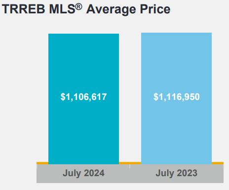 The MLS® Home Price Index Composite benchmark was down by approximately five per cent on a year-over-year basis in July 2024. The average selling price of $1,106,617 was down by 0.9 per cent over the July 2023 result of $1,116,950. On a seasonally adjusted monthly basis, both the MLS® HPI Composite and the average selling price were up slightly compared to June 2024.