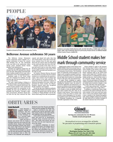 Bellerose Avenue celebrates 50 years The Bellerose Avenue Elementary School community joined together for a special celebration to honor the school’s 50th birthday Nov. 18. The schoolwide event was held in the auditorium, where special guests included former faculty members and administrators. Principal Lori Beekman hosted the celebration and the PTA provided the decorations and cake. Fifth-graders and former Bellerose students kicked off the event with a performance of the “Star Spangled Banner.” Beekman spoke to the crowd about what she imagined the building was like 50 years ago and how proud she was to be a part of the school. “It’s such a good feeling to belong to a place that has such a rich and proud history.” In honor of the special anniversary, the school recently opened a time capsule that was placed inside the cornerstone of the building 50 years ago by Bellerose’s first principal Dan Frumerin. Through a slideshow presentation, Beekman shared photos from the day they removed the time