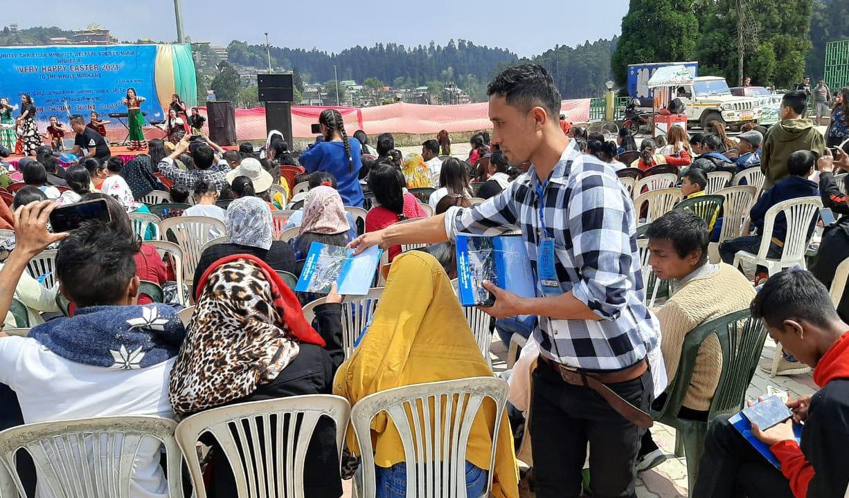 En evangelist deler ut Introkurset under en tilstelning i Himalaya.