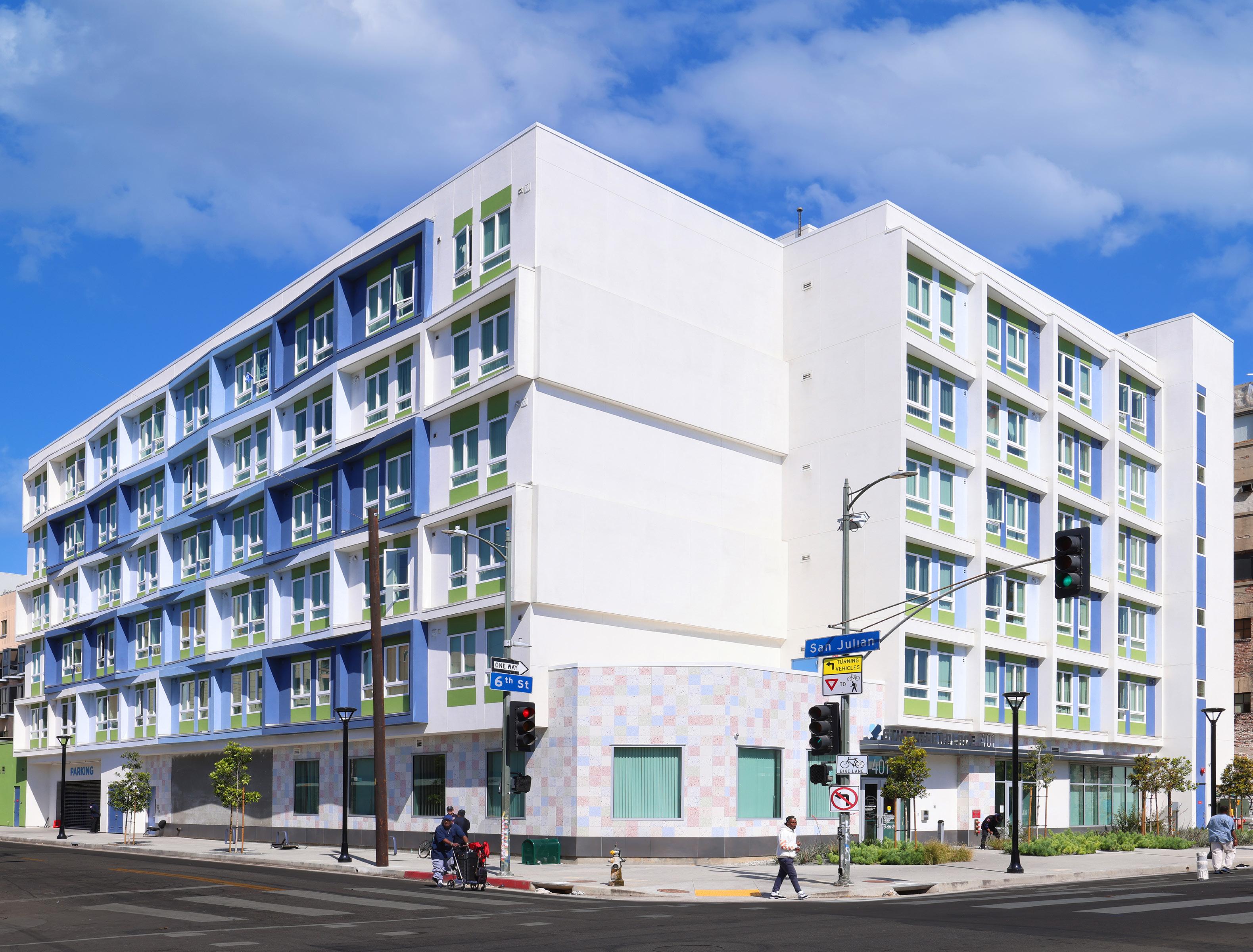 Not only does 6th Street Place provide much needed housing for the homeless, but also fosters a strong sense of community through art and architecture. Built in a factory and assembled on site, modular design is environmentally friendly by reducing construction waste and impacts to the community. The front-facing wall will feature a projected scroll showing artworks created by residents to be enjoyed every evening. The project achieved LEED Gold certification.