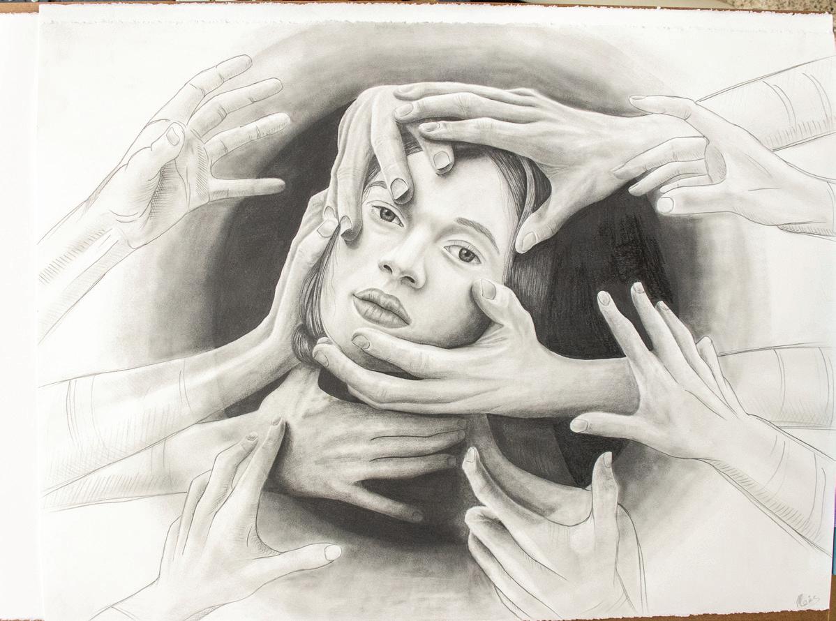 “Intrusive Thoughts,” pencil on paper by Megan Meier. Meier got her friend to model for this drawing.