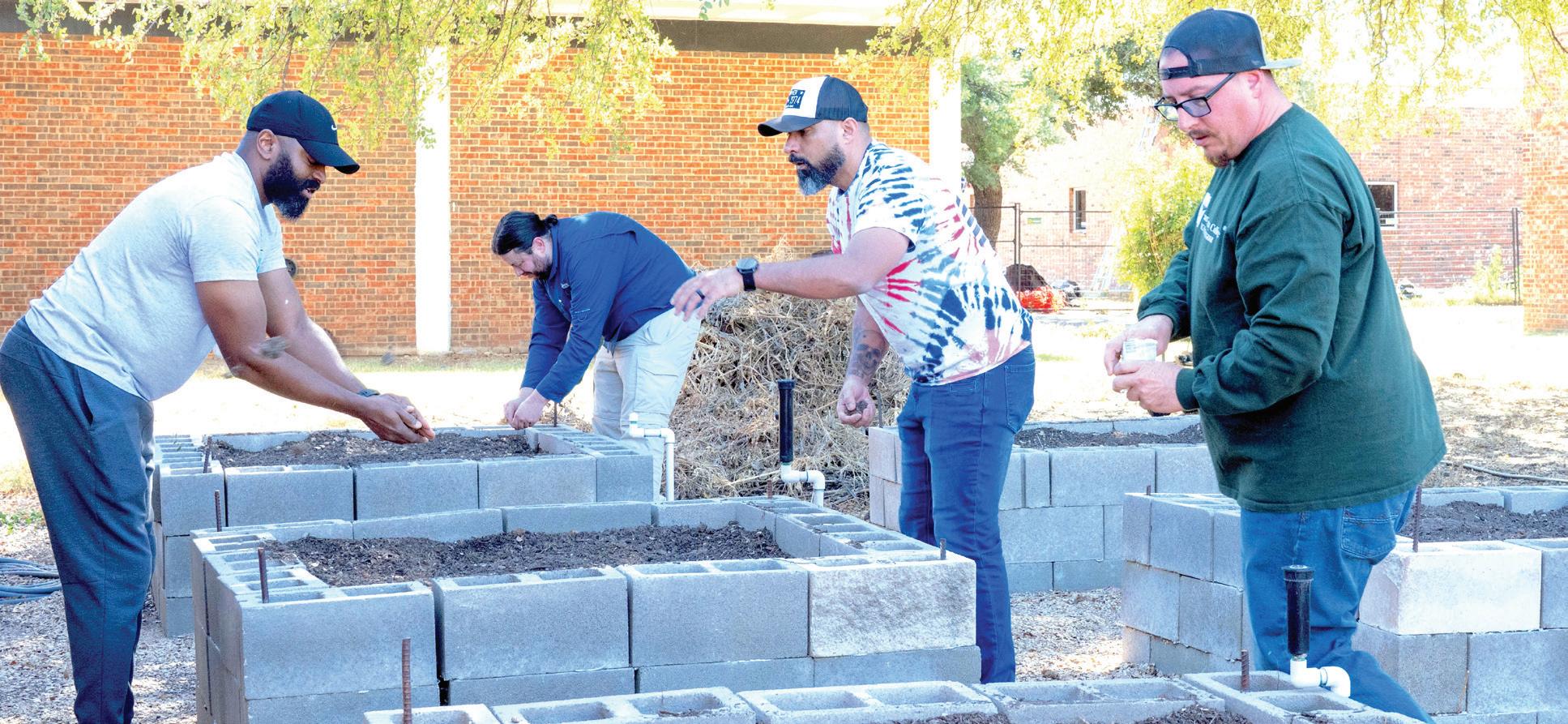 SVA Secretary Derek Cloutier and South student Sylvester Rutherford break up the soil in one of the raised garden beds that benefits the Tarrant County Food Bank.