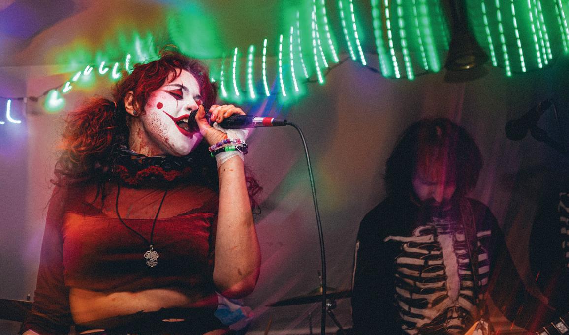 Colorful lights shined onto a vocalist’s face decorated in clown makeup as their raspy voice assembled a crowd to gather.