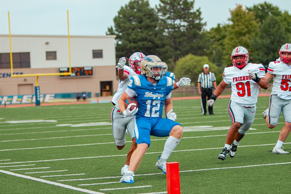 halftime, but the Bluejays returned with fire in their eyes. On their first possession in the third quarter, they scored their first touchdown. They pinned Friends’ quarterback for a safety and then found the end zone again in the fourth quarter, all while holding Friends University to just one touchdown. Even though the final score was 59-15, the Bluejays were able to stop the running game and force turnovers.