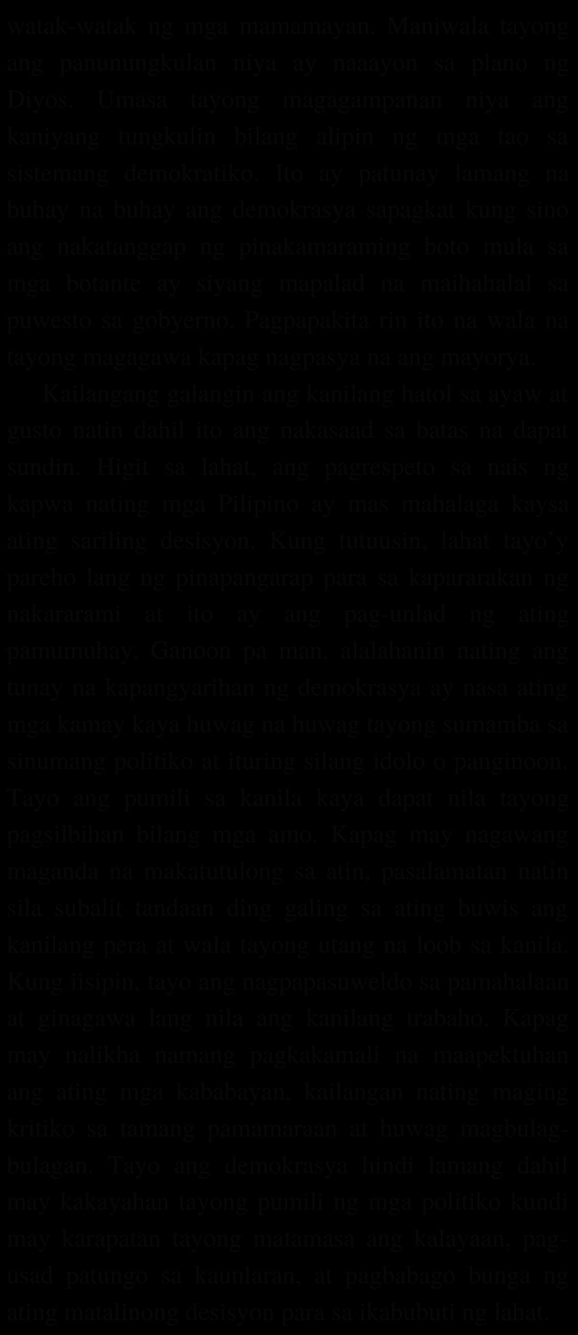 Mahusay kang kumuha Mng ahusay kang kumuha ng mga mlitrato ga litrato Nahahanap mo ang kulay Nat ahahanap mo ang kulay at tamang tanggulo amang anggulo Nabubuhay na kakaiba Nang abubuhay na kakaiba ang pananaw sa pmundo ananaw sa mundo Kaya naman, kuhang Kkuha aya naman, kuhang kuha mo pati mako. o pati ako.